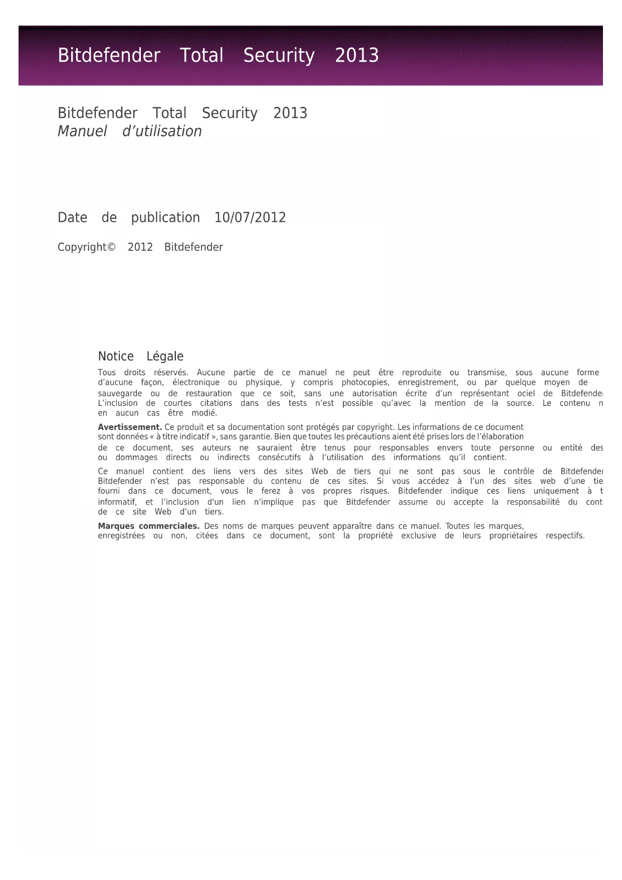 Retrouvez gratuitement la notice de l'appareil Total Security 2013 BITDEFENDER au format PDF.
