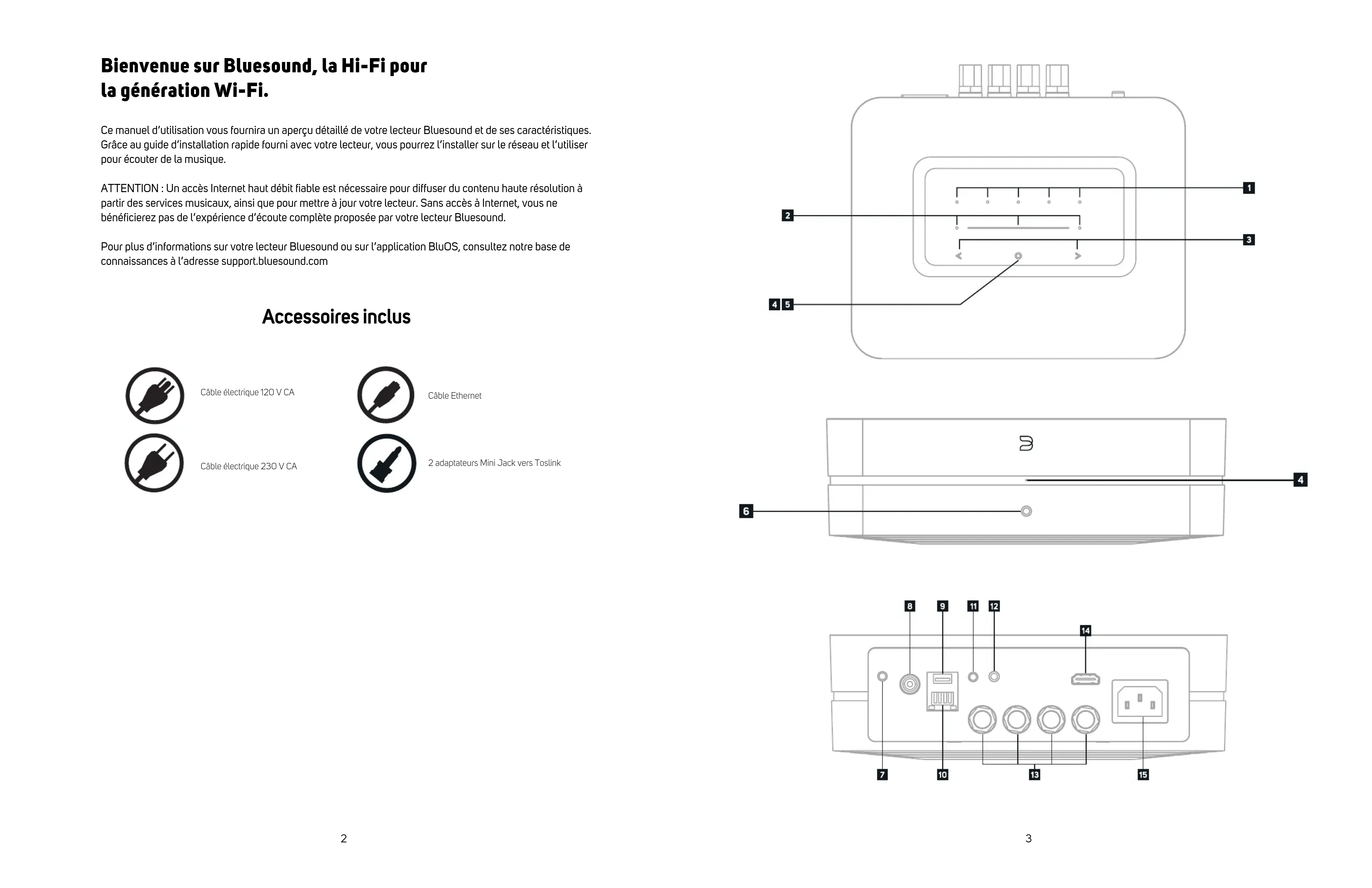 ATTENTION: 1. Un accès Internet haut débit fibre est nécessaire pour diffuser du consuqui haute résolution à partir des services musicaux, ainsi que pourmettre à jourvoite lecleur.Sans accès a Internet,vou ne bénéficiencer pas de l'expérience d'écoutecomplete proposée parvoite leclaur Bluesound.