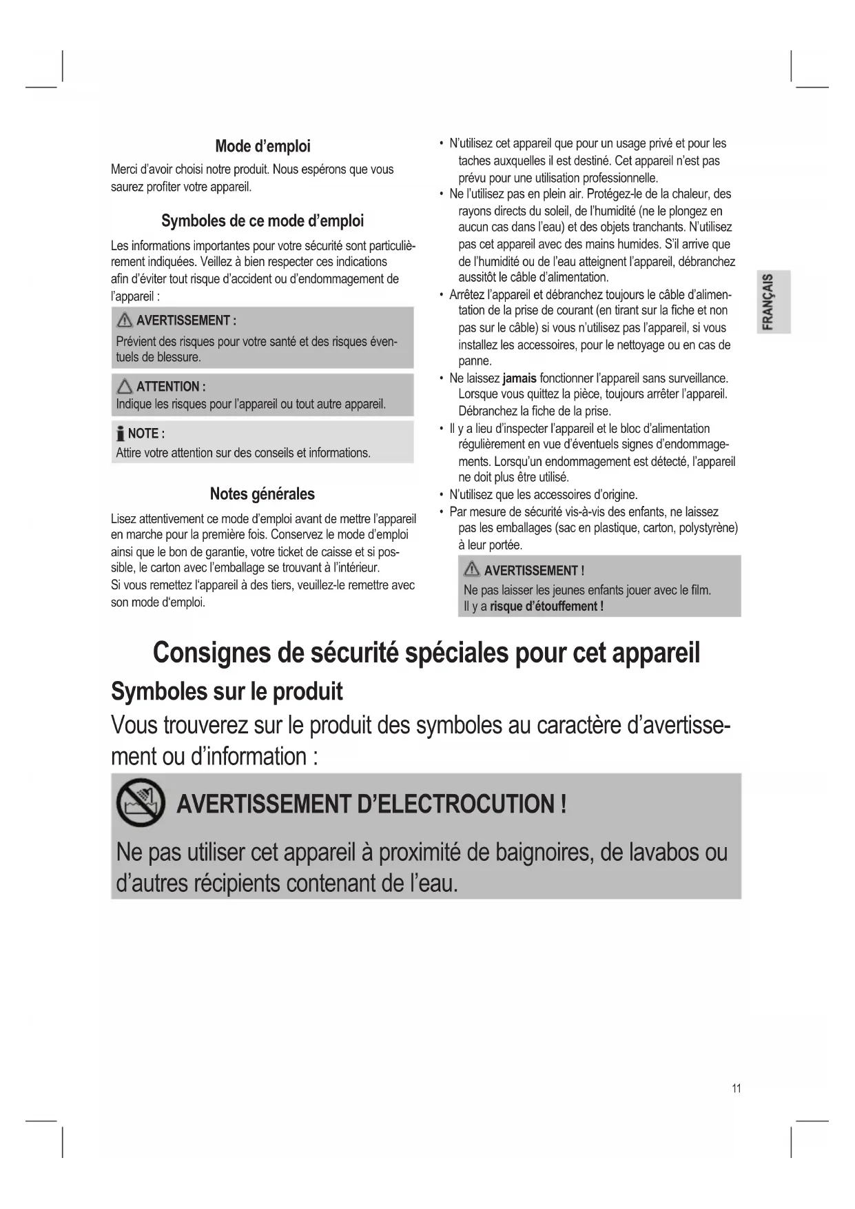 • Ne laissez jamais fonctionner l’appareil sans surveillance.