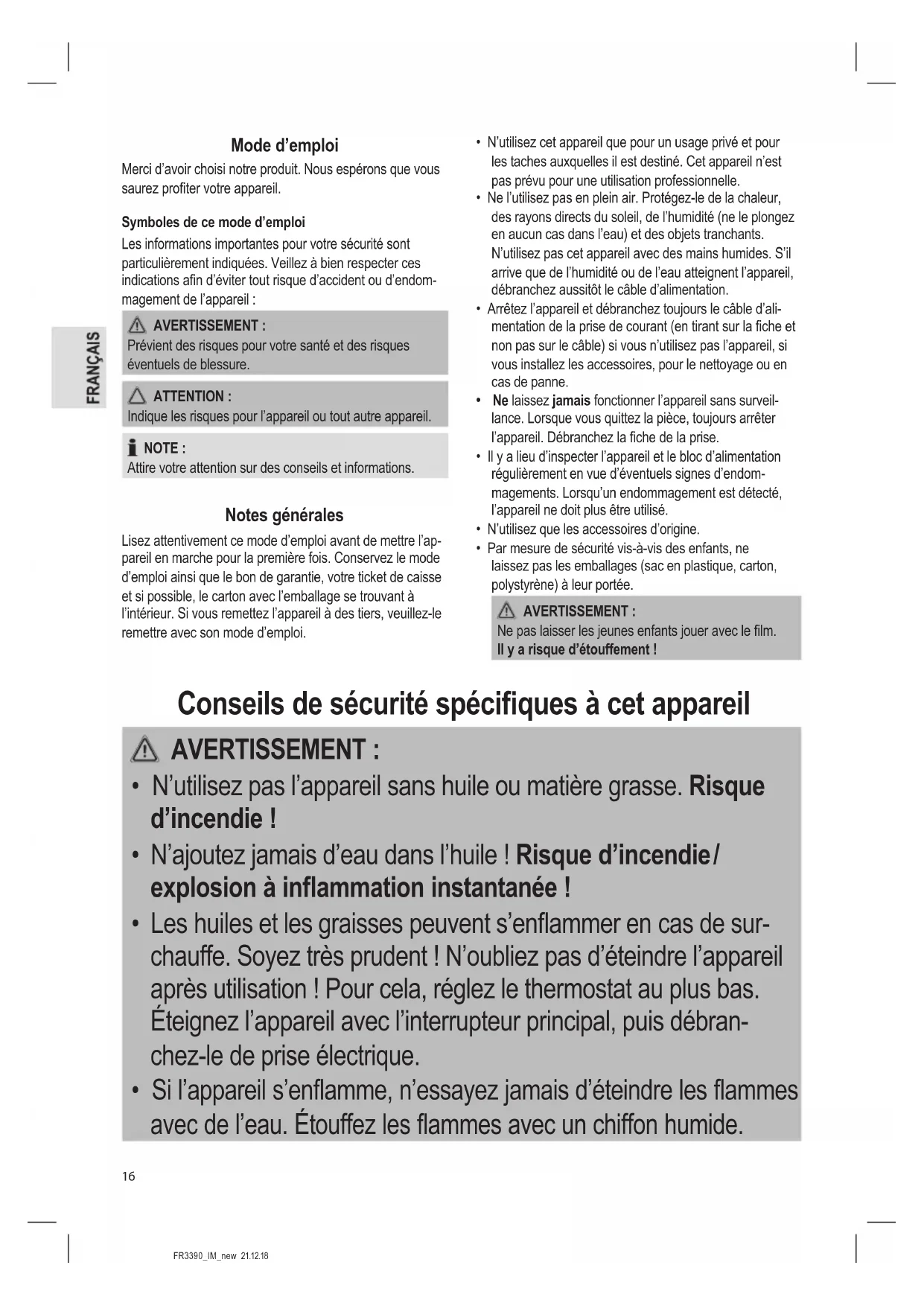 FR 3390 - Friteuse CLATRONIC - Notice d'utilisation et mode d'emploi gratuit
