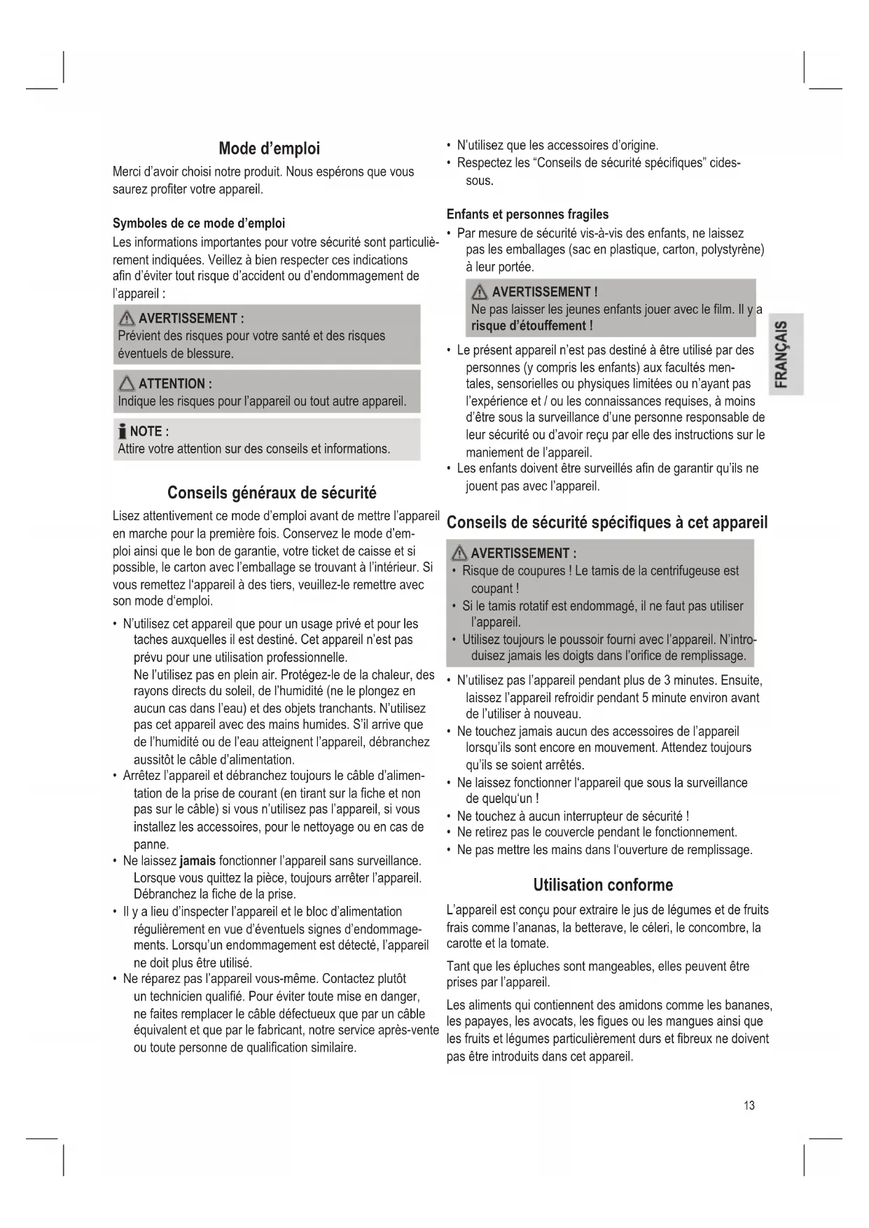 Prévient des risques pour votre santé et des risques éventuels de blessure. ATTENTION : Indique les risques pour l’appareil ou tout autre appareil. NOTE : Attire votre attention sur des conseils et informations. Conseils généraux de sécurité Lisez attentivement ce mode d’emploi avant de mettre l’appareil en marche pour la première fois. Conservez le mode d’em- ploi ainsi que le bon de garantie, votre ticket de caisse et si possible, le carton avec l’emballage se trouvant à l’intérieur. Si vous remettez l‘appareil à des tiers, veuillez-le remettre avec son mode d‘emploi.