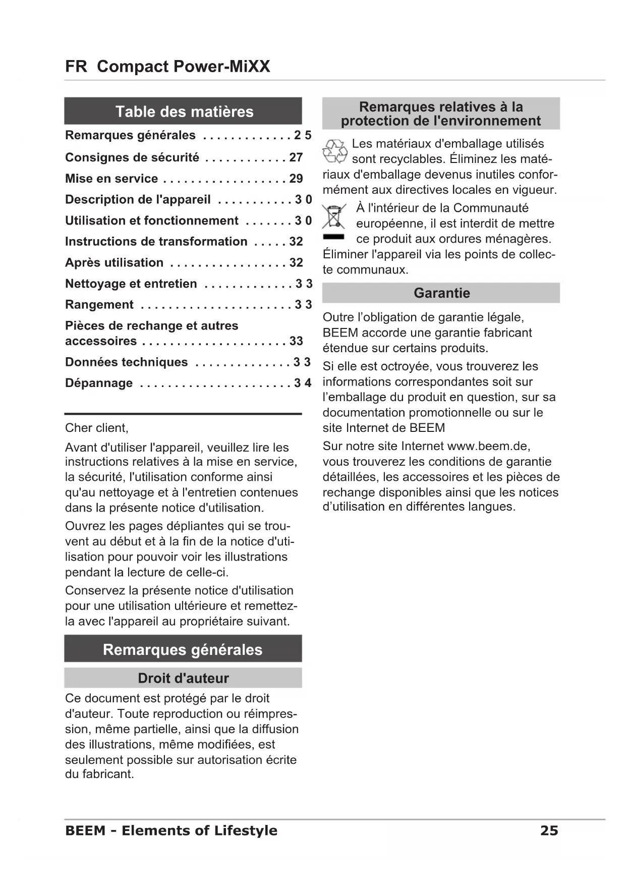 - Net weight approx. 0.96 kg Operating voltage 220-240V~ Mains fre- quency 50 Hz Power 250 W Protection class II Type of protec- tion IP2024 Compact Power-MiXX EN BEEM - Elements of Lifestyle Troubleshooting The following table will help you locate and eliminate minor faults: fault Possible cause Remedy The appliance does not operate after pressing the pushbutton. Plug not inserted into socket. Insert plug. Automatic circuit breaker in electrical distribution board tripped. Switch on the automatic circuit breaker again. The internal safety switch has switched off the appliance as a result of overheating. Allow the appliance to cool down. The mixing bowl, lid or the output attachment has not been properly tted. Fit and lock the mixing bowl, output attachment or lid properly. The automatic circuit breaker in the electrical distribution board trips. Too many appliances connect- ed to the same power circuit. Reduce the number of appliances on the power circuit. No fault detected. Contact customer service. Motor runs extremely slowly or stops. Mixing bowl overlled. Remove some of the ingredients. NOTE If you cannot resolve the problem with the steps described above, please contact ► customer service.25 FR Compact Power-MiXX BEEM - Elements of Lifestyle Cher client, Avant d'utiliser l'appareil, veuillez lire les instructions relatives à la mise en service, la sécurité, l'utilisation conforme ainsi qu'au nettoyage et à l'entretien contenues dans la présente notice d'utilisation. Ouvrez les pages dépliantes qui se trou- vent au début et à la n de la notice d'uti- lisation pour pouvoir voir les illustrations pendant la lecture de celle-ci. Conservez la présente notice d'utilisation pour une utilisation ultérieure et remettez- la avec l'appareil au propriétaire suivant. Remarques générales Droit d'auteur Ce document est protégé par le droit d'auteur. Toute reproduction ou réimpres- sion, même partielle, ainsi que la diffusion des illustrations, même modiées, est seulement possible sur autorisation écrite du fabricant. Remarques relatives à la protection de l'environnement Les matériaux d'emballage utilisés sont recyclables. Éliminez les maté- riaux d'emballage devenus inutiles confor- mément aux directives locales en vigueur. À l'intérieur de la Communauté européenne, il est interdit de mettre ce produit aux ordures ménagères. Éliminer l'appareil via les points de collec- te communaux. Garantie Outre l’obligation de garantie légale, BEEM accorde une garantie fabricant étendue sur certains produits. Si elle est octroyée, vous trouverez les informations correspondantes soit sur l’emballage du produit en question, sur sa documentation promotionnelle ou sur le site Internet de BEEM Sur notre site Internet www.beem.de, vous trouverez les conditions de garantie détaillées, les accessoires et les pièces de rechange disponibles ainsi que les notices d’utilisation en différentes langues. Remarques générales p. 25