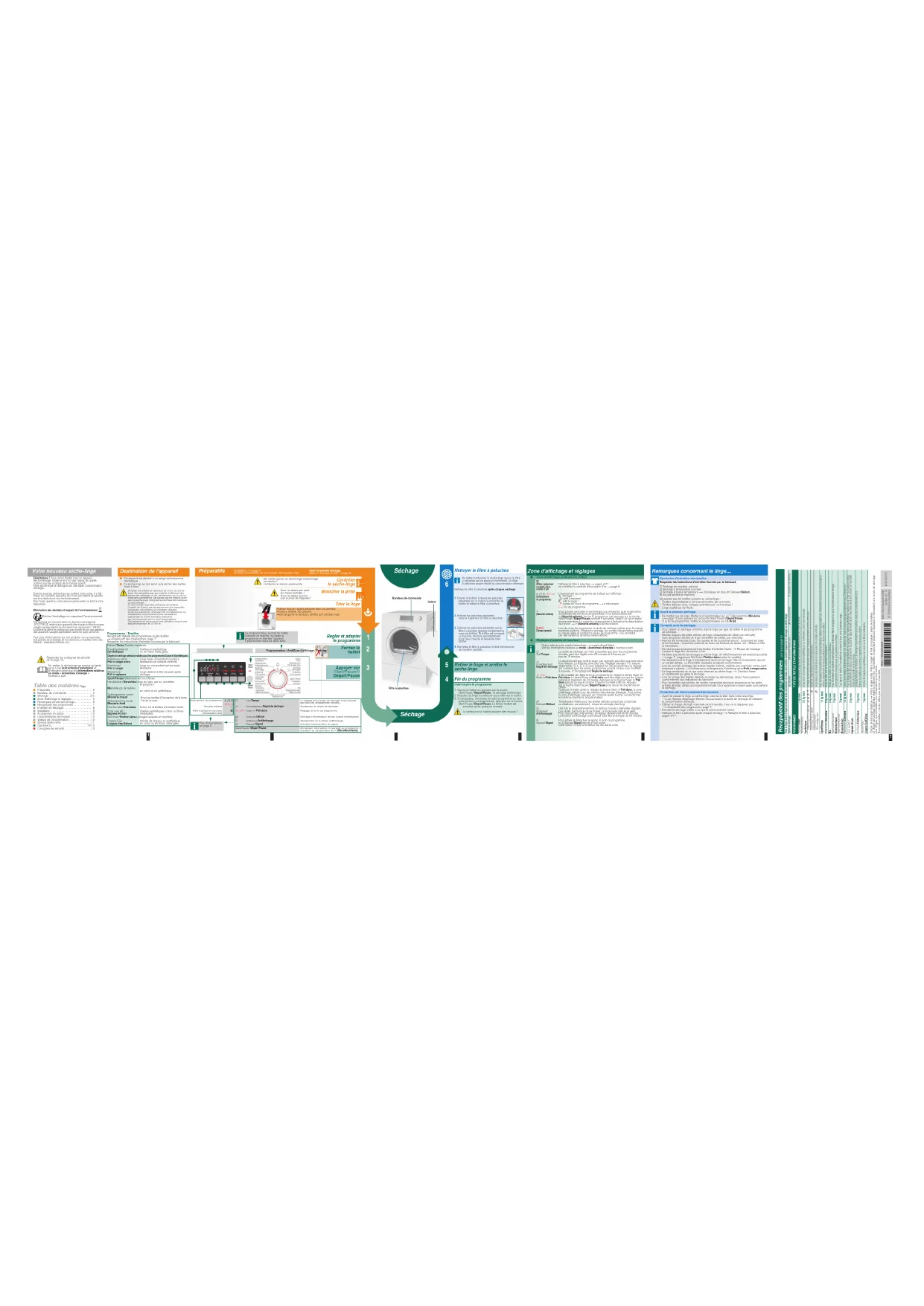 ʋ Consignes de sécurité . . . . . . . . . . . . . . . . . . 13 Ne mettez jamais un sèche-linge endommagé en service !Contactez le service après-vente.hc(c 'c a V )caaaaaȗaaaaaInstallation a page 9 et notice d'installation de la conduite d'évacuation d'air.Respectez les consignes de sécurité de la page 13.Ne mettez le sèche-linge en service qu'après avoir lu les instructions d'installation et d'utilisation ainsi que les informations relatives au mode « économies d'énergie » fournies à part.aLe programmateur permet de mettre l'appareil en marche, de régler le programme et d'arrêter l'appareil. Il peut tourner dans les deux sens. ` Avancement du programmeSécurité enfantsH|]+ - Æ->