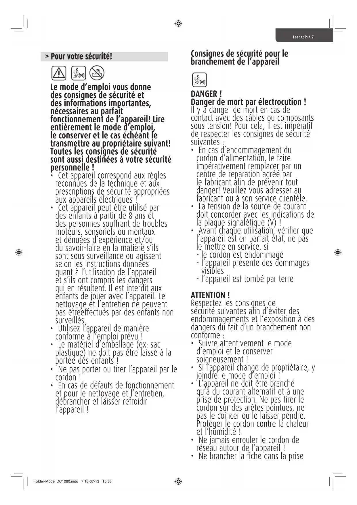 - Ne brancher la fiche dans la prise Folder-Model DC1080.indd 7 18-07-13 15:388 • Français de courant que lorsque l’appareil est éteint! Consignes de sécurité pour l’utilisation de l’appareil Danger de mort par électrocution ! Il y a danger de mort si l’appareil sous tension entre en contact avec de l’eau ! Pour cela, il est impératif de respecter les consignes de sécurité suivantes :