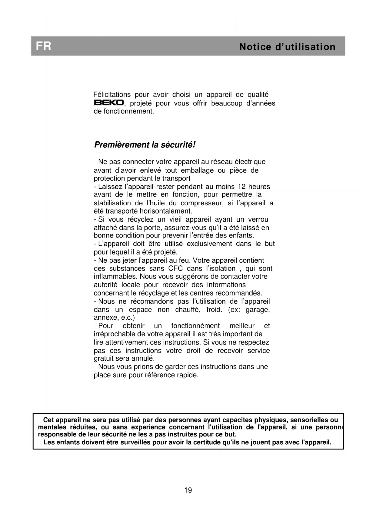 Cet appareil ne sera pas utilisé par des personnes ayant capacites physiques, sensorielles ou
