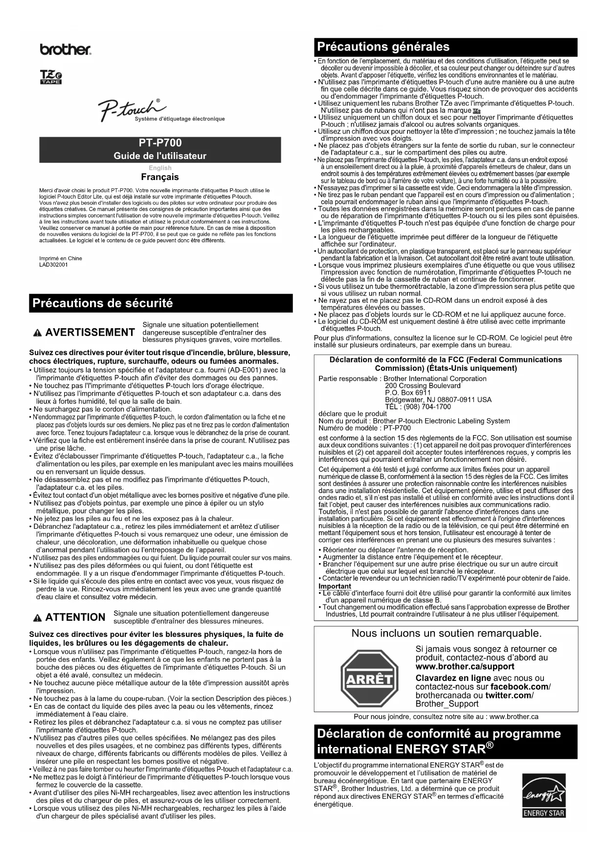 Commission) (États-Unis uniquement) Partie responsable : Brother International Corporation200 Crossing BoulevardP.O. Box 6911Bridgewater, NJ 08807-0911 USATÉL : (908) 704-1700déclare que le produitNom du produit : Brother P-touch Electronic Labeling SystemNuméro de modèle : PT-P700est conforme à la section 15 des règlements de la FCC. Son utilisation est soumise aux deux conditions suivantes : (1) cet appareil ne doit pas provoquer d'interférences nuisibles et (2) cet appareil doit accepter toutes interférences reçues, y compris les interférences qui pourraient entraîner un fonctionnement non désiré.Cet équipement a été testé et jugé conforme aux limites fixées pour un appareil numérique de classe B, conformément à la section 15 des règles de la FCC. Ces limites sont destinées à assurer une protection raisonnable contre les interférences nuisibles dans une installation résidentielle. Cet équipement génère, utilise et peut diffuser des ondes radio et, s’il n’est pas installé et utilisé en conformité avec les instructions dont il fait l’objet, peut causer des interférences nuisibles aux communications radio. Toutefois, il n'est pas possible de garantir l'absence d'interférences dans une installation particulière. Si cet équipement est effectivement à l'origine d'interférences nuisibles à la réception de la radio ou de la télévision, ce qui peut être déterminé en mettant l'équipement sous et hors tension, l'utilisateur est encouragé à tenter de corriger ces interférences en prenant une ou plusieurs des mesures suivantes :• Réorienter ou déplacer l'antenne de réception.• Augmenter la distance entre l'équipement et le récepteur.• Brancher l'équipement sur une autre prise électrique ou sur un autre circuit électrique que celui sur lequel est branché le récepteur.• Contacter le revendeur ou un technicien radio/TV expérimenté pour obtenir de l'aide.Important• Le câble d'interface fourni doit être utilisé pour garantir la conformité aux limites d'un appareil numérique de classe B.• Tout changement ou modification effectué sans l’approbation expresse de Brother Industries, Ltd pourrait contraindre l’utilisateur à ne plus utiliser l’équipement. Nous incluons un soutien remarquable.