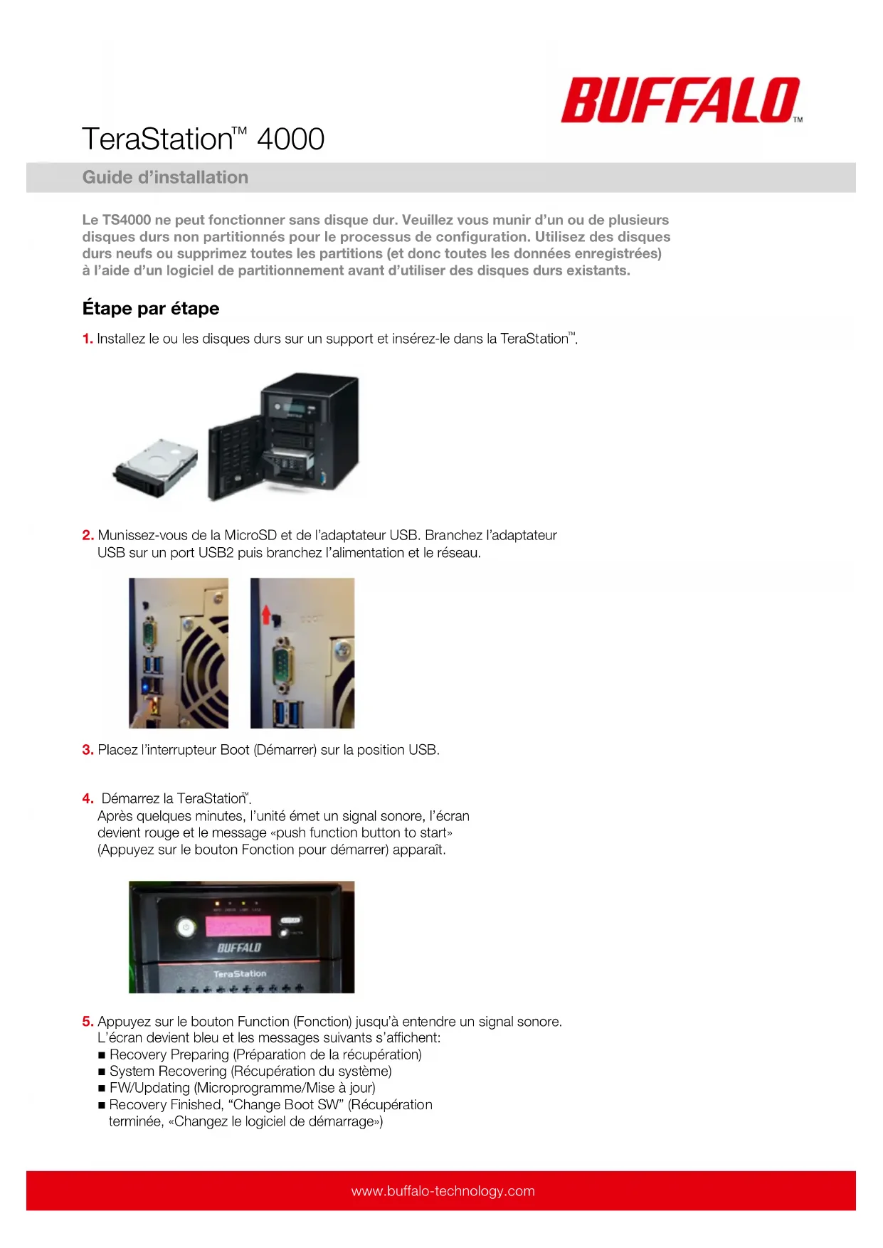 Remarque: Si vous allumez l‘unité TeraStation ™ sans avoir installé de disque dur, l‘unité s‘arrête avec un avertissement et un message indiquant que le démarrage des disques durs a échoué apparaît sur l‘écran éclairé rouge. Dans ce cas, veuillez appuyer longuement sur le bouton Power (Mise en marche) pour éteindre l‘unité et reprendre les instructions de ce guide depuis l‘étape 1. Si l‘interrupteur Boot (Démarrer) était en position HDD au lieu d‘être en position USB lors du démarrage (étape 3 omise), l‘unité fait apparaît «boot from HDD1» (Démarrage depuis HDD1) dans le statut. Dans ce cas, veuillez appuyer longuement sur le bouton Power (Mise en marche) pour éteindre l‘unité et reprendre les instructions depuis l‘étape 2. www.buffalo-technology.com