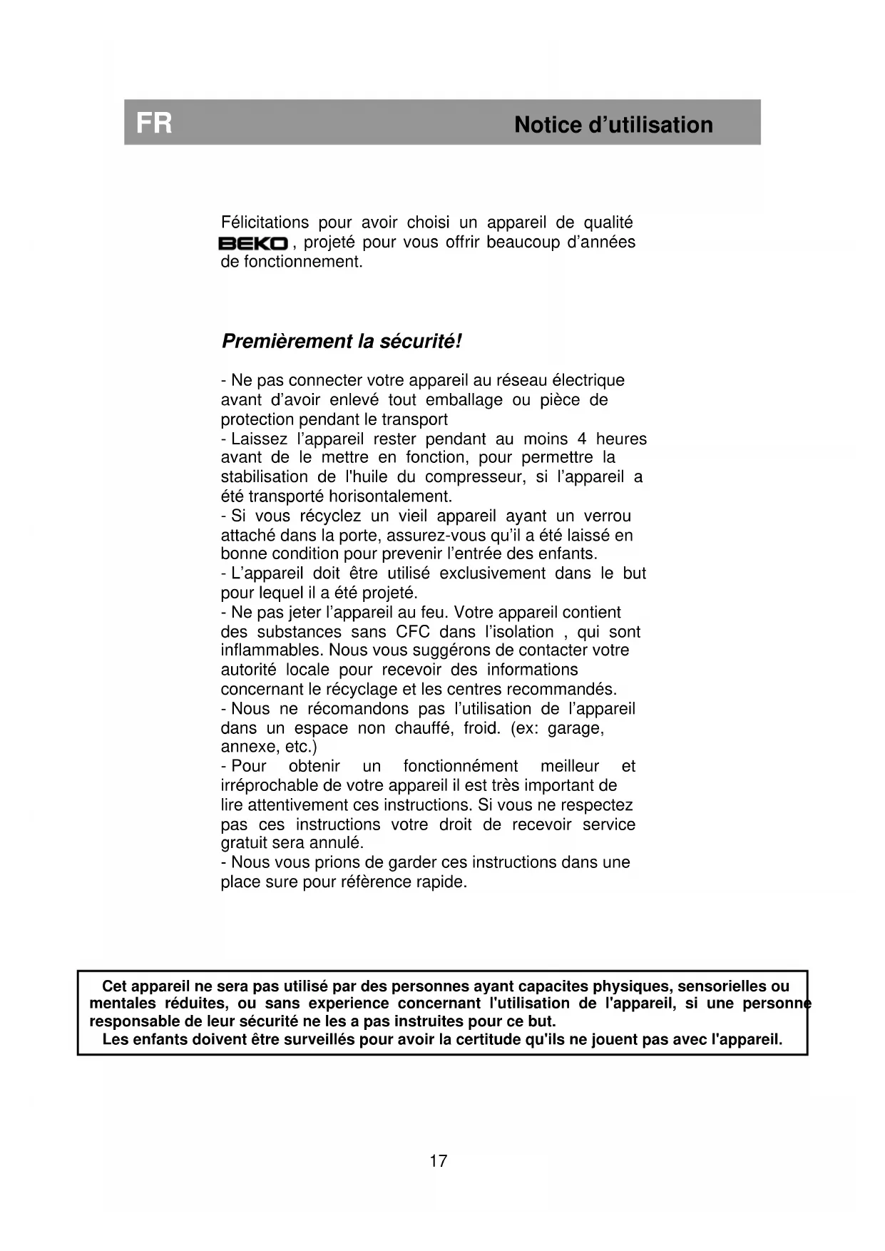 no están conformes con el tipo de aparato recomendado por el fabricante.Premièrement la sécurite! /17 Avertissements et conseils importants /18 Installation /18 Branchement au réseau /19 Presentation de l’appareil /19 Mise en fonctionnement /19 Réversibilité de la porte /19 Entreposage des produits a conserver /19 Réglage de la température /20 Changement de la lampe /20 Congélation des produits frais /20 Conservation des produits congelés /21 Production des cubes des glace /21 Décongélation /21 Dégivrage /21 Nettoyage /22 Remarques sur les bruits de fonctionnement /22 Dates techniques /23