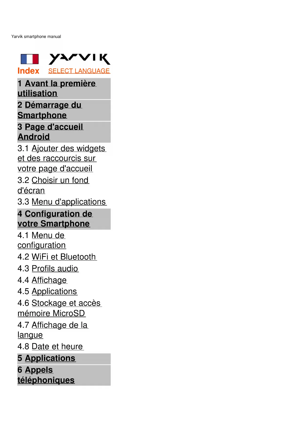 5 Applications 6 Appels téléphoniquesYarvik smartphone manual file:///Users/elroy/Desktop/Yarvik/Manual/manual_fr.html[08-10-13 11:23:24] 7 Messagerie 8 Déclaration de garantie 9 Informations de licence GNU/GPL 10 Important information 1 Avant la première utilisation Madame, Monsieur, Nous vous remercions d'avoir choisi ce produit. Pour garantir une utilisation rapide et pratique de votre Smartphone Yarvik, veuillez lire attentivement ces instructions avant son utilisation. Nous vous souhaitons de profiter pleinement, et le plus longtemps possible, de cet appareil. Remarque :
