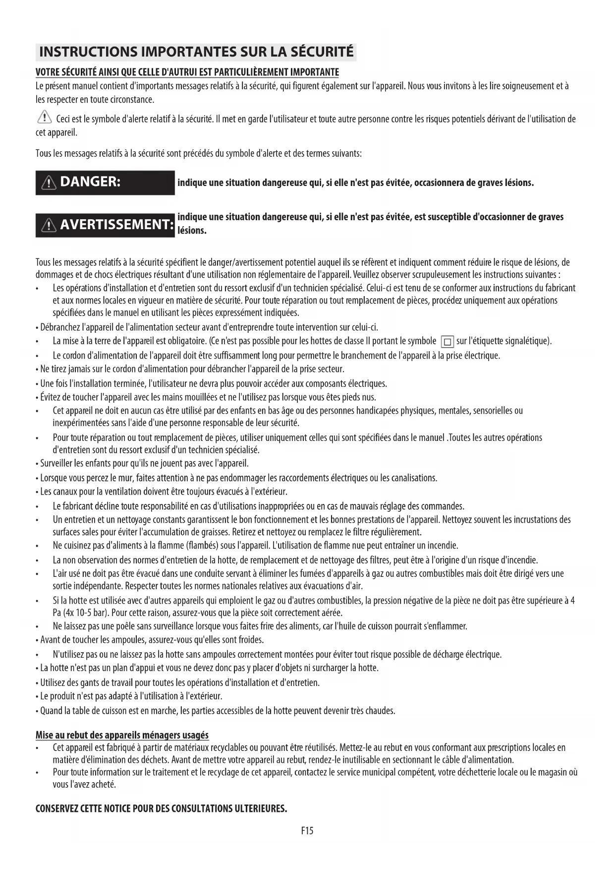 CONSERVEZ CETTE NOTICE POUR DES CONSULTATIONS ULTERIEURES.
