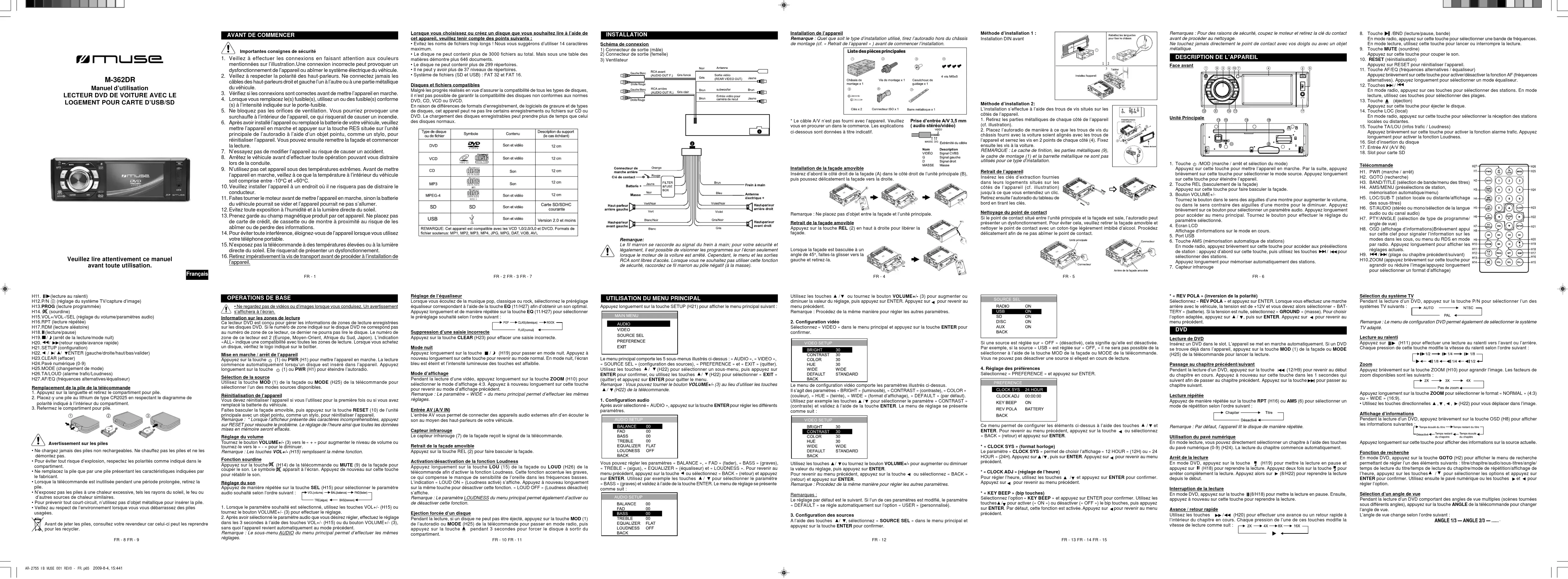 2 canaux 50-20000Hz 60dB 60dB En dessous du seuil mesurable SPÉCIFICATIONS Le symbole de l’éclair terminé par une flèche et situé dans un triangle vise à avertir l’utilisateur de la présence d’une «tension dangereuse» dans l’appareil. Le point d’exclamation situé dans un triangle vise à avertir l’utilisateur de la présence d’instructions importantes dans le manuel accompagnant votre appareil. ATTENTION ! Des radiations invisibles sont émises lorsque les parties protégées sont défectueuses ou ouvertes. Évitez toute exposition aux rayons laser. AVERTISSEMENT Pour réduire le risque d’incendie ou d’électrochoc, n’exposez pas cet appareil à la pluie ou à l’humidité. Si vous souhaitez vous débarrasser de cet appareil, pensez à le recycler dans une décharge pour appareils ménagers électriques. Renseignez-vous pour connaître votre centre de recyclage le plus proche. Informez-vous auprès des autorités locales ou de votre revendeur pour de plus amples détails. (Directive sur les Déchets des équipements électriques et électroniques) ATTENTION ! Pour réduire le risque d’électrochoc, n’ouvrez pas le boîtier de l’appareil. Aucune partie utile à l’utilisateur ne se situe à l’intérieur de celui-ci. Faites exclusivement appel à un technicien qualifié pour tout entretien. AVERTISSEMENTS Général Alimentation requise Impédance de charge Sortie électrique Maximale Contrôles de la tonalité Dimensions Dimensions pour le montage Poids Section FM Gamme de fréquence Gamme IF Sensibilité utilisable (-30dB) Ratio de signal de bruit Séparation stéréo Réponse de fréquence Section MW Gamme de fréquence: Gamme IF Sensibilité utilisable (-20dB) Section lecteur VCD/CD Système de signaux VCD Ratio de signal de bruit Séparation Distorsion Section lecteur DVD Système de signaux DVD Nombre de canal Réponse de fréquence Gamme dynamique Ratio de signal de bruit Pleurage et scintillement Causes/solutions Vérifiez si le fusible n’est pas fondu. Si c’est le cas, remplacez-le par un fusible équivalent. Appuyez sur RES pour réinitialiser l’appareil. Vérifiez si l’antenne est correctement connectée. L’antenne n’a peut-être pas la longueur appropriée. Veillez à ce qu’elle soit complètement étirée. Remplacez-la si elle est abîmée. L’antenne n’est pas mise à la masse correctement. Un disque se trouve déjà dans l’appareil. Le disque est sale ou endommagé. Le câble vidéo reliant l’unité principale à l’écran n’est pas bien connecté. Le réglage du système couleur n’est pas approprié. Sélectionnez le système PAL ou NTSC en fonction de votre écran. Problèmes Pas d’alimentation. L’écran LCD affiche des infor- mations incorrectes ou ne répond pas. Impossible de capter une station. Mauvaise qualité de réception radio. FR - 23 FR - 30 FR - 24 FR - 31 Formats audio et vidéo supportés : MP3: 32kbps-320kbps JPEG:Jusqu’à 7296 x 5472 pixels. MPEG: MPEG-1, MPEG-2, MPEG-4 ASP(DivX) AVI: Jusqu’à 720X576 Pixels VOB(DVD): 720X480i, 720X576i, 720X480p, 720X576p DivX: 3.11/4.0/5.0 USB: 2.0, 1.1, 1.0 (Débit de transfert des données USB : USB 1.1 (full speed)) ATTENTION ! Cet appareil utilise un rayon laser. Pour prévenir tout accident dû à ce type de rayon, l’appareil ne doit être ouvert que par un technicien qualifié. Cet appareil est conforme aux normes internationales de sécurité, aux directives européennes et aux normes en vigueur en matière de sécurité électrique et de compatibilité électromagnétique. FR - 19 FR - 20 FR - 21 FR - 22 Impossible d’insérer un disque. Le son saute. Pas d’image. Image de mauvaise qualité. Remarques :