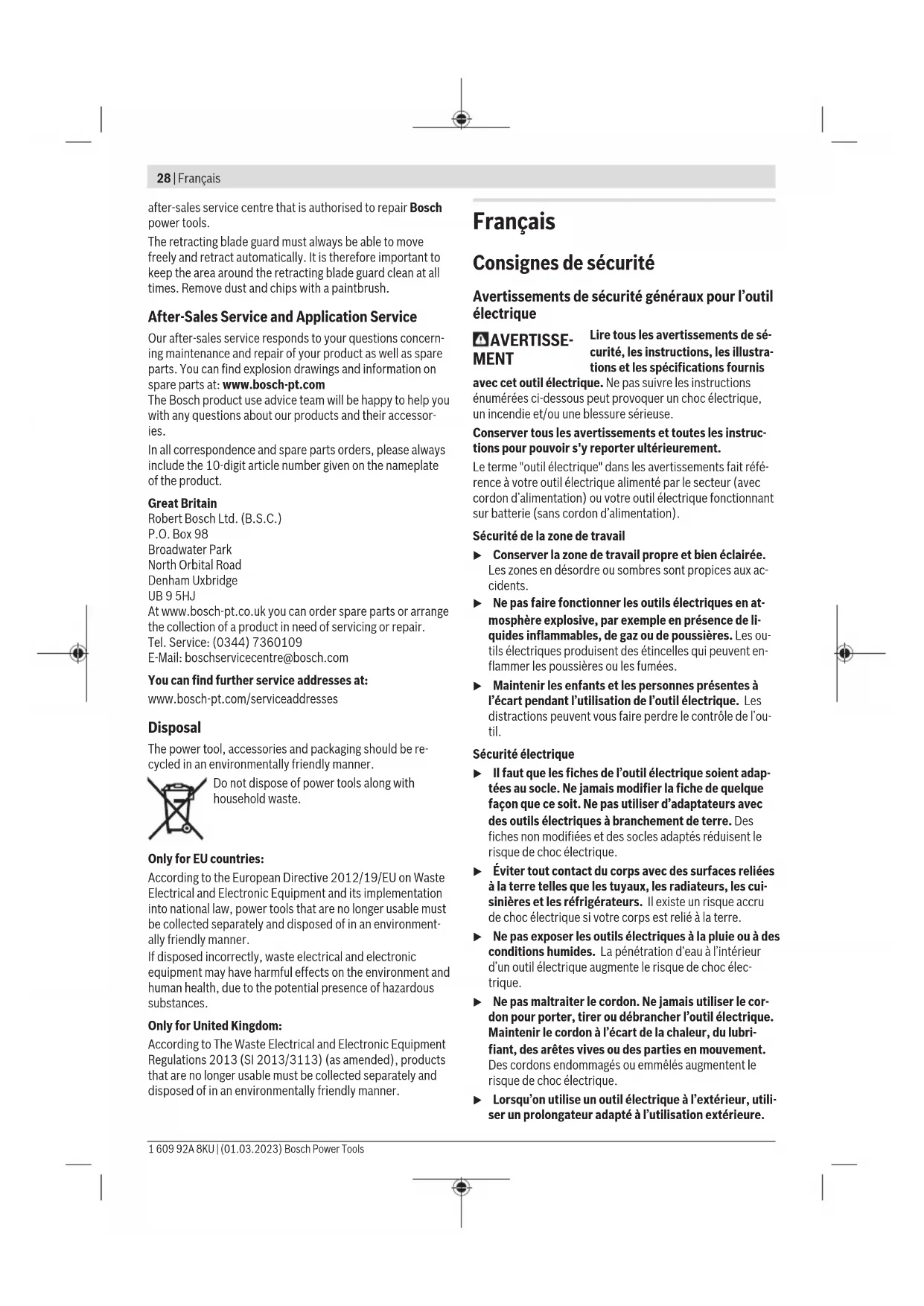 risque de choc électrique. u Lorsqu’on utilise un outil électrique à l’extérieur, utili- ser un prolongateur adapté à l’utilisation extérieure. 1 609 92A 8KU | (01.03.2023) Bosch Power ToolsFrançais | 29