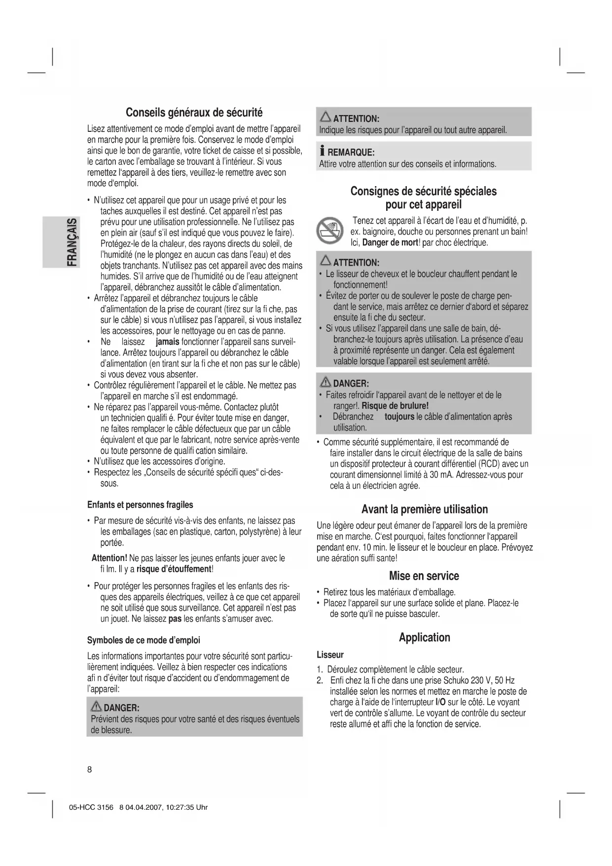 FRANÇAIS FRANÇAIS Conseils généraux de sécurité