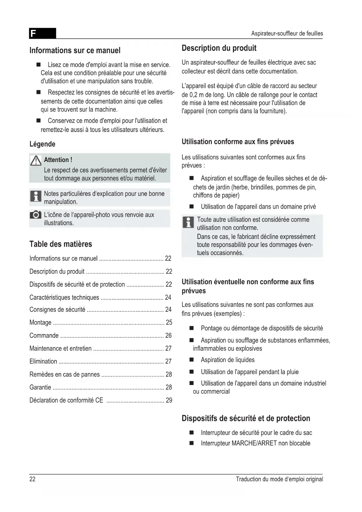 - Aspirateur-soufeur de feuilles Description du produit Un aspirateur-soufeur de feuilles électrique avec sac collecteur est décrit dans cette documentation. L'appareil est équipé d'un câble de raccord au secteur de 0,2 m de long. Un câble de rallonge pour le contact de mise à terre est nécessaire pour l'utilisation de l'appareil (non compris dans la fourniture). Utilisation conforme aux ns prévues Les utilisations suivantes sont conformes aux ns prévues : Aspiration et soufage de feuilles sèches et de dé- chets de jardin (herbe, brindilles, pommes de pin, chiffons de papier) Utilisation de l'appareil dans un domaine privé Toute autre utilisation est considérée comme utilisation non conforme. Dans ce cas, le fabricant décline expressément toute responsabilité pour les dommages éven- tuels occasionnés. Utilisation éventuelle non conforme aux ns prévues Les utilisations suivantes ne sont pas conformes aux ns prévues (exemples) : Pontage ou démontage de dispositifs de sécurité Aspiration ou soufage de substances enammées, inammables ou explosives Aspiration de liquides Utilisation de l'appareil pendant la pluie Utilisation de l'appareil dans un domaine industriel ou commercial Dispositifs de sécurité et de protection Interrupteur de sécurité pour le cadre du sac Interrupteur MARCHE/ARRET non blocable Informations sur ce manuel Lisez ce mode d'emploi avant la mise en service. Cela est une condition préalable pour une sécurité d'utilisation et une manipulation sans trouble. Respectez les consignes de sécurité et les avertis- sements de cette documentation ainsi que celles qui se trouvent sur la machine. Conservez ce mode d'emploi pour l'utilisation et remettez-le aussi à tous les utilisateurs ultérieurs. Légende Attention ! Le respect de ces avertissements permet d'éviter tout dommage aux personnes et/ou matériel. Notes particulières d‘explication pour une bonne manipulation. L‘icône de l‘appareil-photo vous renvoie aux illustrations. Table des matières Informations sur ce manuel p. 22