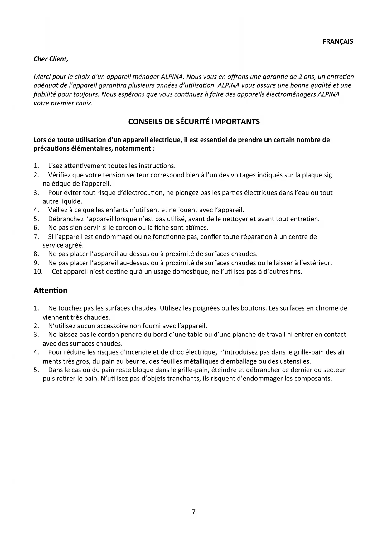 Merci pour lechioix d'un apparéil menager ALPINA. Nous vous en offrons une garantie de 2 ans, un entretien ajustat de l' apparéil garantira plusieurs années d'utilisation. ALPINA vous assure une bonne qualité et une fiabilité pour toujours. Nous espérons que vous continue à faire des apparéils electroménagers ALPINA chez la premièreCHOIX.