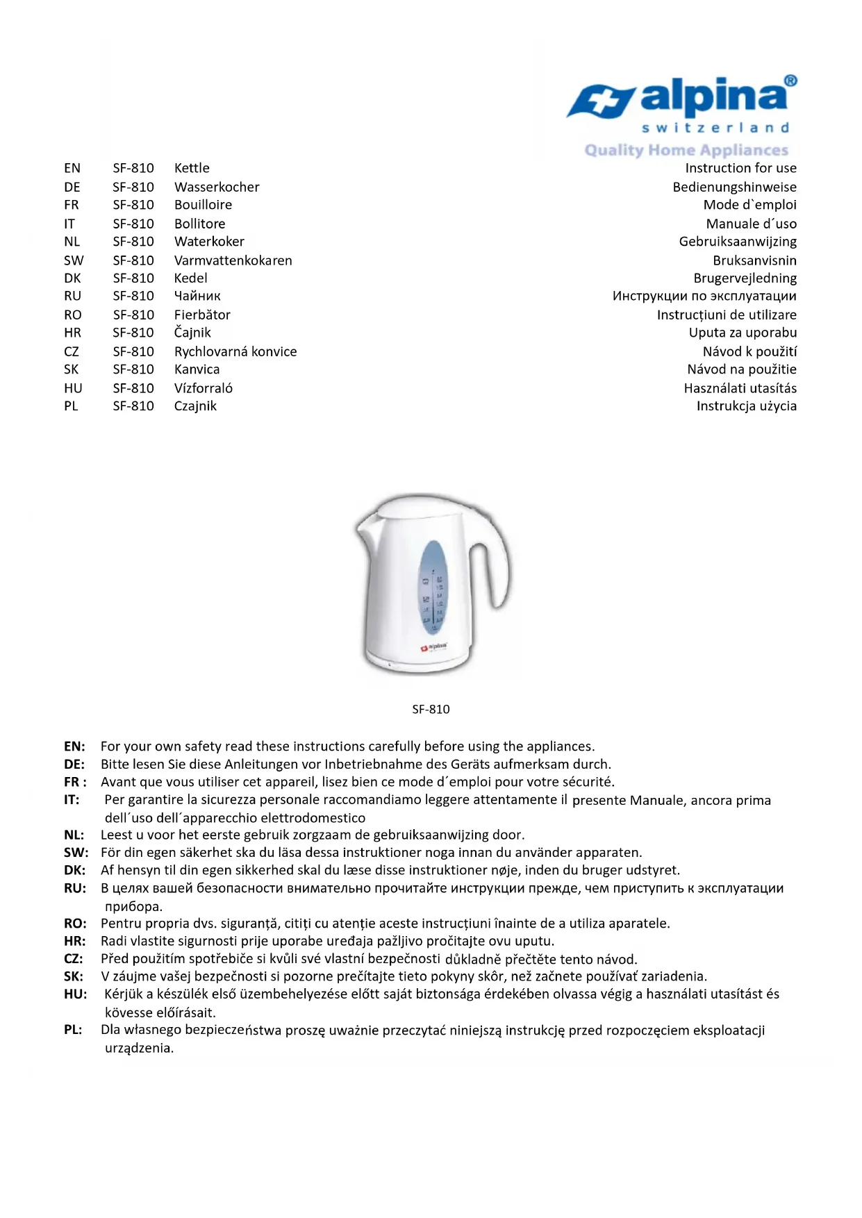 SF 810 - Bouilloire ALPINA - Notice d'utilisation et mode d'emploi gratuit