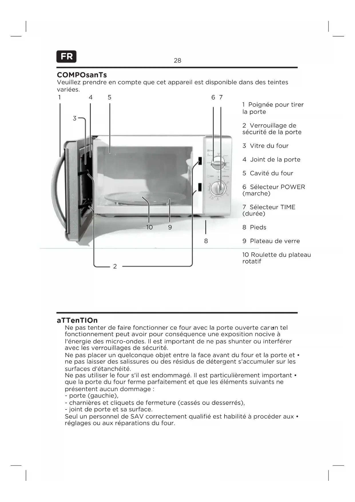 2 Verrouillage de sécurité de la porte 3 Vitre du four 7 Sélecteur TIME (durée) 9 Plateau de verre 10 Roulette du plateau rotatif 4 Joint de la porte 5 Cavité du four 6 Sélecteur POWER (marche) 8 Pieds 1 Poignée pour tirer la porte28