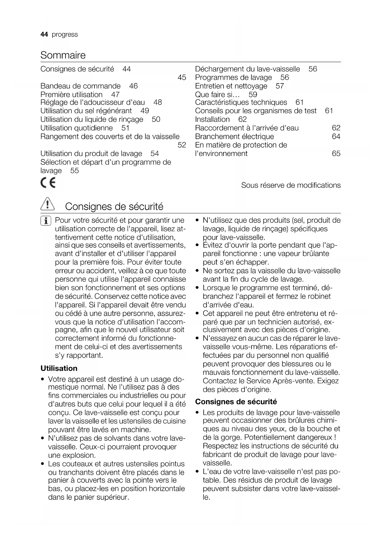 - L'eau de votre lave-vaisselle n'est pas po- table. Des résidus de produit de lavage peuvent subsister dans votre lave-vaissel- le. 44 progress• Assurez-vous que la porte du lave-vaissel- le est toujours correctement fermée lors- que vous n'êtes pas occupé à le remplir ou le vider. Vous éviterez ainsi que quelqu'un ne trébuche sur la porte ouverte et ne se blesse.