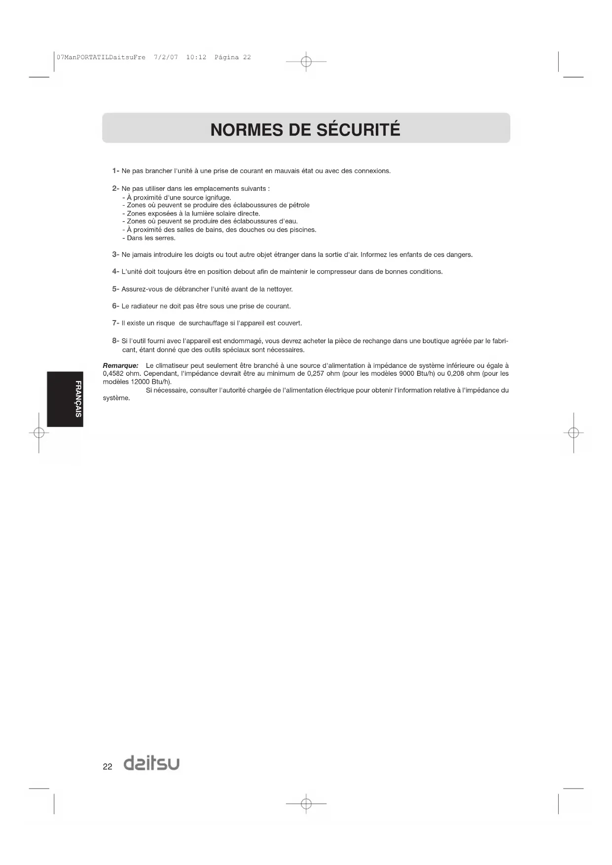 DÉPANNAGE Problèmes L'unité ne sa'llume pas en pressant sur la touche 1/0 Insuffisamment froid Débranchement de l'unité en mode chauffage Bruits ou vibrations Bruit de moulin Causes éventuelles Solutions éventuelles L'indicateur de remplissage d'eau clignote ; le dépôt de drainage est plein. Videz l'eau du dépôt de drainage. La température ambiante est supérieure à la température réglée (mode chauffage). Reprogrammer la température. La température ambiante est inférieure à la température réglée (mode réfrigération). Reprogrammer la température. Les portes ou les fenêtres de la pièce ne sont pas fermées. Assurez-vous que toutes les portes et les fenêtres de la pièce sont fermées. Il y a des sources de chaleur dans la pièce. Éliminez si possible les sources de chaleur. Le conduit d'extraction d'air n'est pas branché ou est bloqué. Branchez le conduit et assurez-vous qu'il fonc- tionne correctement. La température programmée est trop élevée. Diminuer la température programmée. La poussière bloque le filtre à air. Nettoyer le filtre à air. Fonction automatique de protection de rechauffage. Lorsque la température de la sorte d'air dépasse les 70°C, le dispositif s'a- rrêtera. Rallumez-le si l'unité s'est refroidie. Le sol n'est pas nivelé ou n'est pas suffisam- ment plat. Placez si possible l'unité sur un sol plat et nivelé. Le bruit provient du flux du réfrigérant qui se trouve dans le climatiseur. C'est normal. 07ManPORTATILDaitsuFre 7/2/07 10:12 Página 30ENGLISH