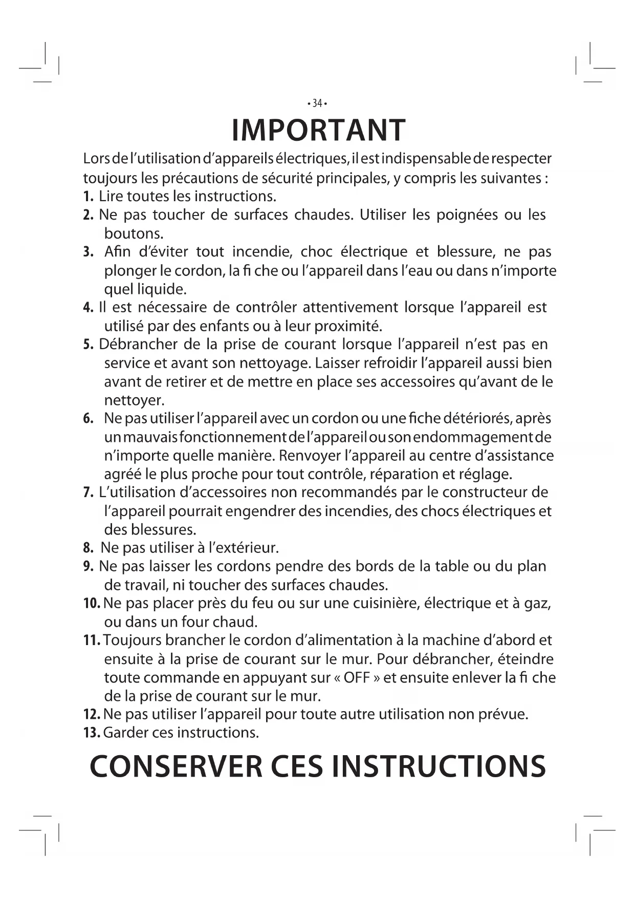 IMPORTANT Lors de l’utilisation d’appareils électriques, il est indispensable de respecter