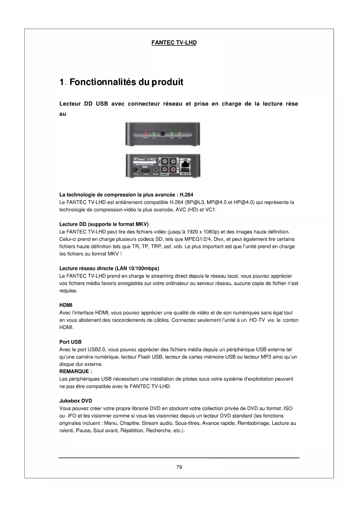 La technologie de compression la plus avancée : H.264 Le FANTEC TV-LHD est entièrement compatible H.264 (BP@L3, MP@4.0 et HP@4.0) qui représente la technologie de compression vidéo la plus avancée, AVC (HD) et VC1. Lecture DD (supporte le format MKV) Le FANTEC TV-LHD peut lire des fichiers vidéo (jusqu’à 1920 x 1080p) et des images haute définition. Celui-ci prend en charge plusieurs codecs SD, tels que MPEG1/2/4, Divx, et peut également lire certains fichiers haute définition tels que TR, TP, TRP, asf, vob. Le plus important est que l’unité prend en charge les fichiers au format MKV ! Lecture réseau directe (LAN 10/100mbps) Le FANTEC TV-LHD prend en charge le streaming direct depuis le réseau local, vous pouvez apprécier vos fichiers média favoris enregistrés sur votre ordinateur ou serveur réseau, aucune copie de fichier n’est requise. HDMI Avec l’interface HDMI, vous pouvez apprécier une qualité de vidéo et de son numériques sans égal tout en vous abstenant des raccordements de câbles. Connectez seulement l’unité à un HD-TV via le cordon HDMI. Port USB Avec le port USB2.0, vous pouvez apprécier des fichiers média depuis un périphérique USB externe tel qu’une caméra numérique, lecteur Flash USB, lecteur de cartes mémoire USB ou lecteur MP3 ainsi qu’un disque dur externe. REMARQUE : Les périphériques USB nécessitant une installation de pilotes sous votre système d’exploitation peuvent ne pas être compatible avec le FANTEC TV-LHD. Jukebox DVD Vous pouvez créer votre propre librairie DVD en stockant votre collection privée de DVD au format .ISO ou .IFO et les visionner comme si vous les visionniez depuis un lecteur DVD standard (les fonctions originales incluent : Menu, Chapitre, Stream audio, Sous-titres, Avance rapide, Rembobinage, Lecture au ralenti, Pause, Saut avant, Répétition, Recherche, etc.).FANTEC TV-LHD Lecture de fichiers au format jpeg Il est désormais possible d’afficher des fichiers image haute définition et de grand volume provenant d'appareils photo numériques. Mise à niveau du firmware