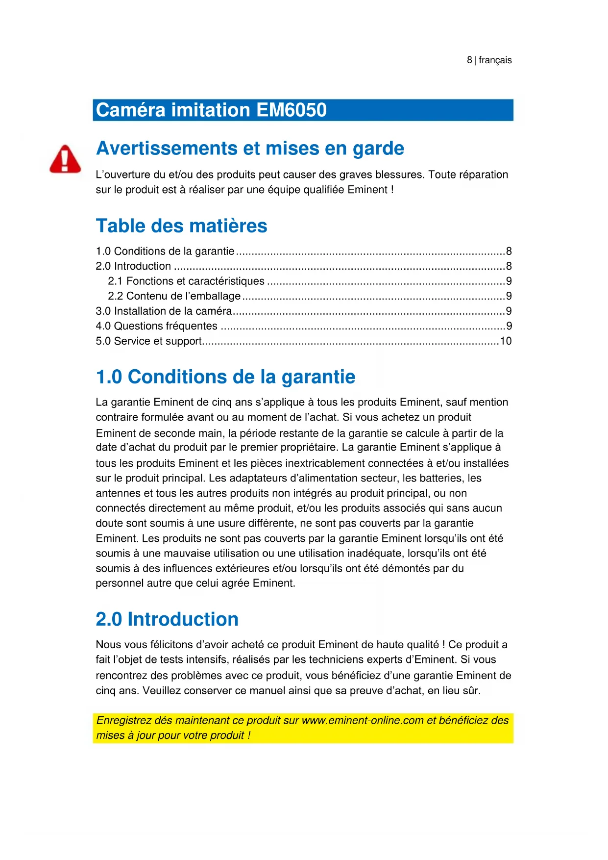 Caméra imitation EM6050 Avertissements et mises en garde L’ouverture du et/ou des produits peut causer des graves blessures. Toute réparation sur le produit est à réaliser par une équipe qualifiée Eminent ! Table des matières