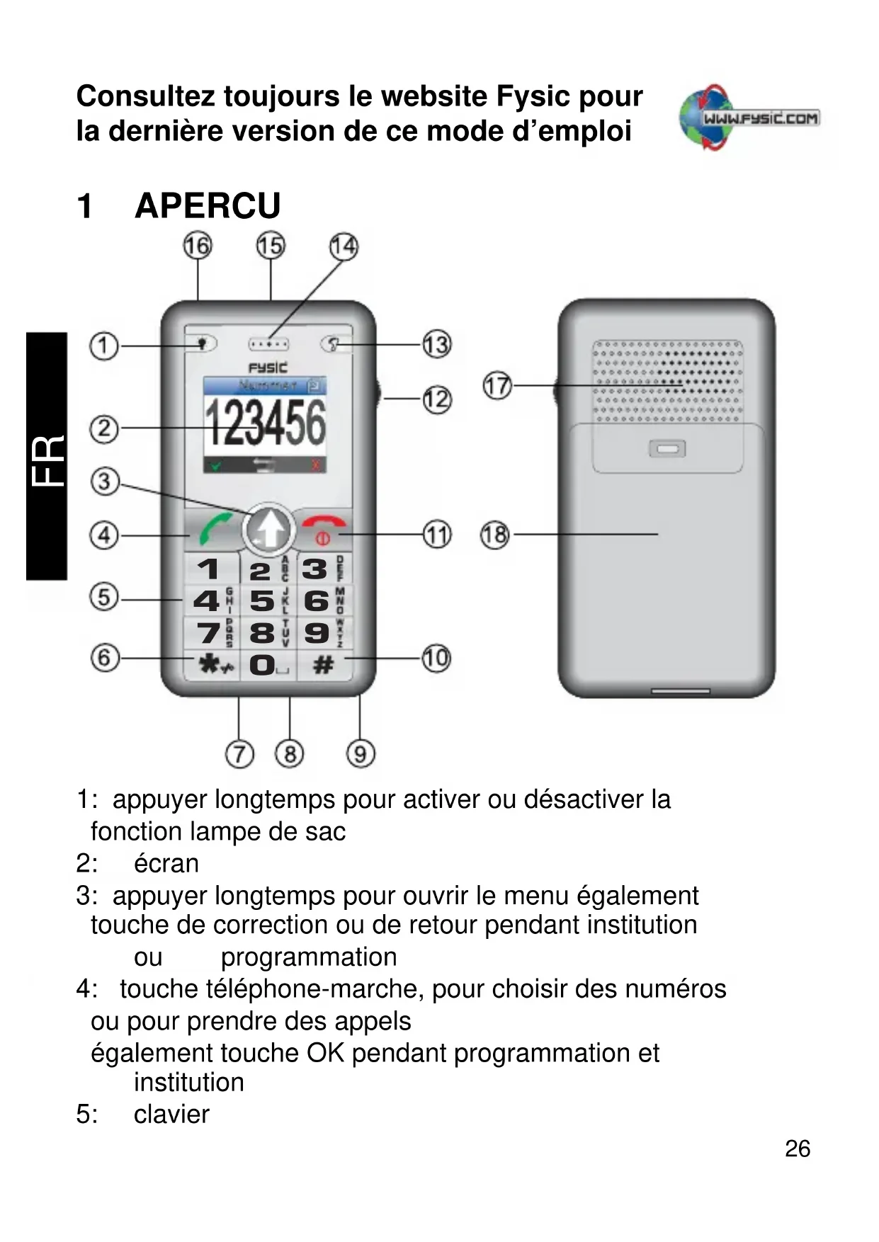 Consultez toujours le website Fysic pour la dernière version de ce mode d’emploi 1 APERCU 1: appuyer longtemps pour activer ou désactiver la fonction lampe de sac 2: écran 3: appuyer longtemps pour ouvrir le menu également touche de correction ou de retour pendant institution ou programmation 4: touche téléphone-marche, pour choisir des numéros ou pour prendre des appels également touche OK pendant programmation et institution 5: clavier Num m m e r
