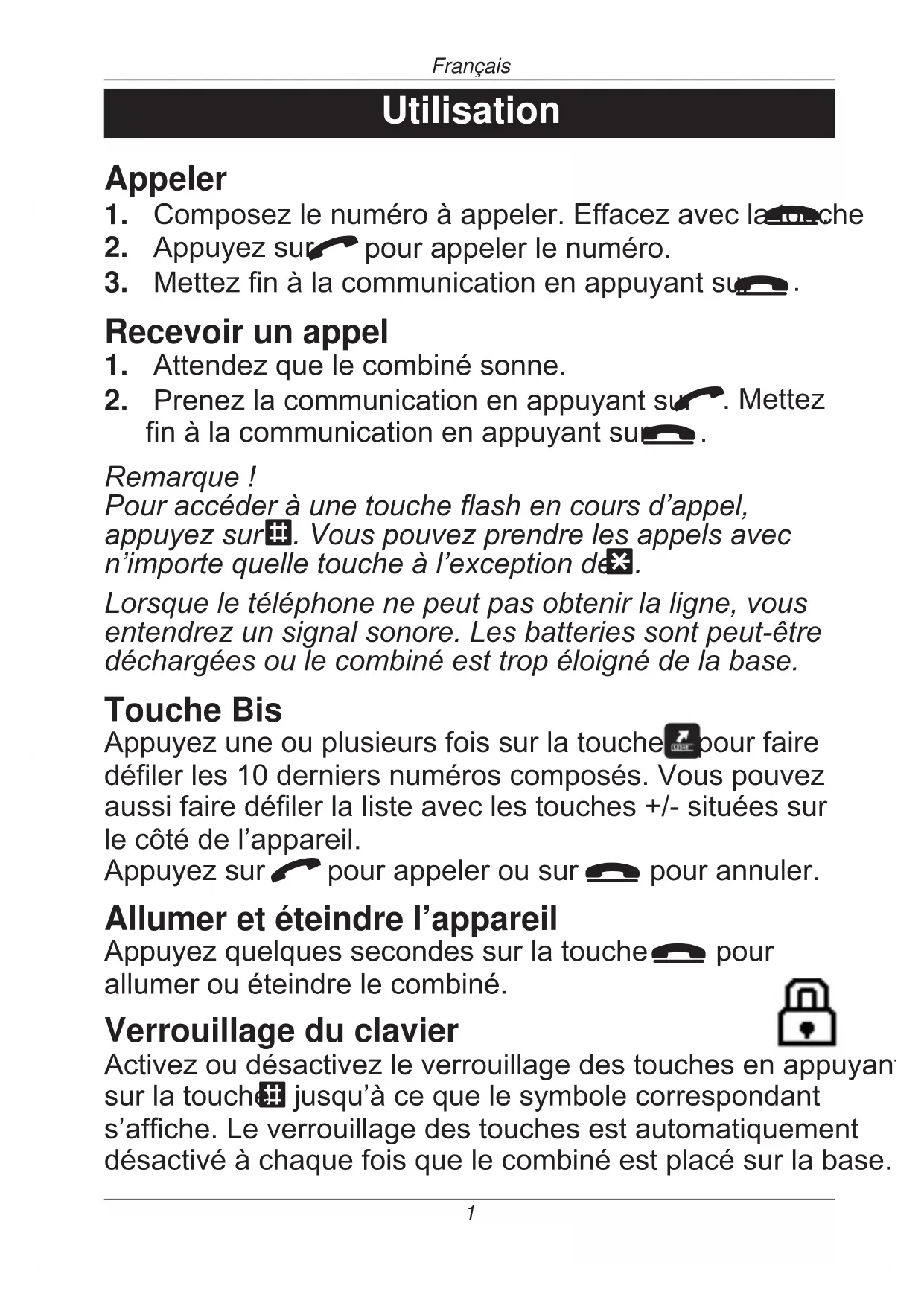 Lorsque le téléphone ne peut pas obtenir la ligne, vous entendrez un signal sonore. Les batteries sont peut-être déchargées ou le combiné est trop éloigné de la base. Touche Bis Appuyezuneouplusieursfoissurlatouche pourfaire délerles10derniersnuméroscomposés.Vouspouvez aussifairedélerlalisteaveclestouches+/-situéessur lecôtédel’appareil. Appuyezsur