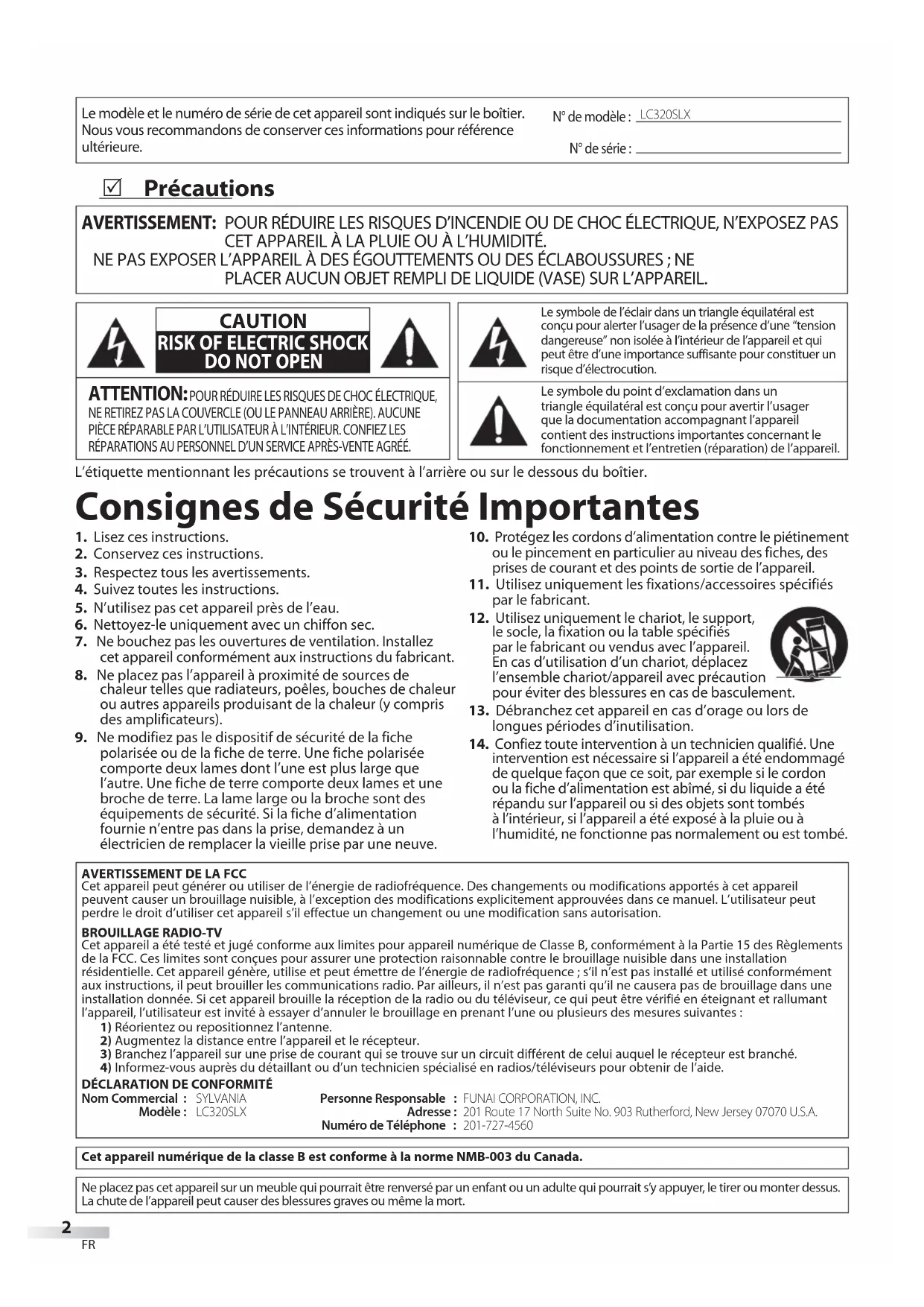 Nom Commercial : SYLVANIA Personne Responsable : FUNAI CORPORATION, INC. Modèle : LC320SLX Adresse : 201 Route 17 North Suite No. 903 Rutherford, New Jersey 07070 U.S.A. Numéro de Téléphone : 201-727-4560 Ne placez pas cet appareil sur un meuble qui pourrait être renversé par un enfant ou un adulte qui pourrait s’y appuyer, le tirer ou monter dessus. La chute de l’appareil peut causer des blessures graves ou même la mort.LC320SLX3
