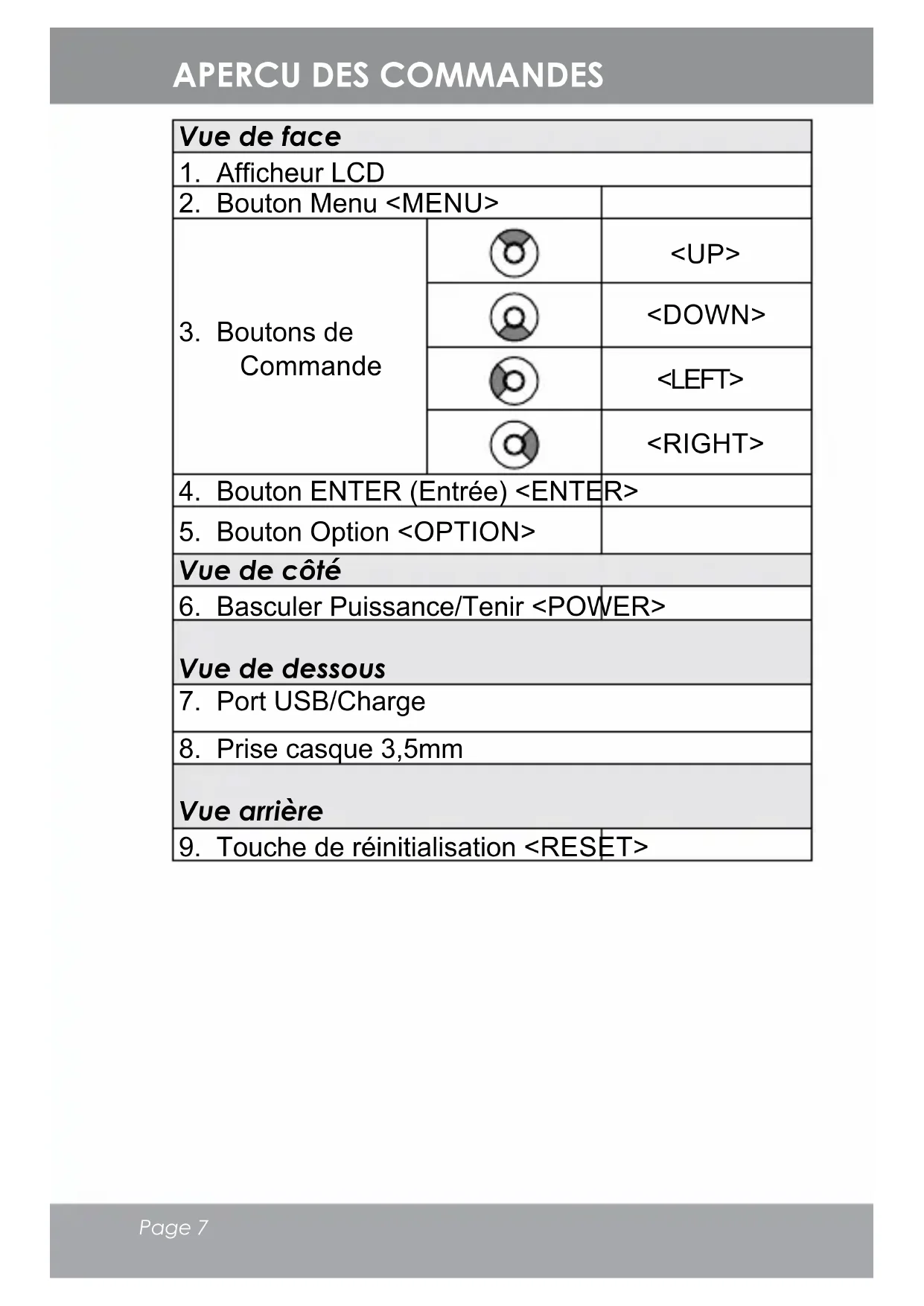 Mise sous/hors tension du lecteur Pour la mise en marche du lecteur, faites glisser le bouton <POWER> vers le bas et maintenez-le jusqu’à ce que l’écran s’allume. Pour éteindre le lecteur, faites glisser le bouton <POWER> vers le bas et maintenez-le jusqu’à ce que l’écran s’éteigne. Réinitialisation du lecteur Réinitialisez le lecteur s’il ne répond plus ou s’il présente un dysfonctionnement. Déconnectez votre lecteur s’il est connecté à un 1. ordinateur. Utilisez un trombone pour appuyer légèrement 2. sur l’orice de réinitialisation <RESET> situé à l’arrière du lecteur. Désactiver les Commandes (Maintenir) Lorsque le bouton <POWER> est en position « Hold », les commandes de votre lecteur sont désactivées. Les commandes peuvent être désactivées pour éviter de mettre le lecteur en marche ou d’activer les commandes accidentellement lorsque le lecteur est dans votre poche ou sac. GUIDE DE DEMARRAGEPage 10 Page 11 Pour désactiver les commandes, faites glisser le bouton <POWER> vers le haut jusqu’à ce qu’il s’enclenche en position « Hold ». Pour activer les commandes, faites glisser le bouton <POWER> vers le bas pour le relâcher de la position « Hold ». Une icône de verrouillage s’afchera sur l’écran lorsque les commandes seront désactivées. Réactivez les commandes pour continuer. MENU PrINCIPaLGUIDE DE DEMarraGEPage 10 Page 11 MENU PRINCIPAL Lorsque vous mettez l’appareil sous tension, le menu principal s’afche. Le menu principal vous donne accès aux différents modes de fonctions de votre lecteur. Ces modes sont les suivants : Musique :Parcourir et lire des chiers musicaux. Images : Parcourir et afcher des chiers images. Films : Parcourir et lire des lms. Text (Livres électroniques) : Parcourir et lire des chiers texte. Explorateur : Parcourir tous les chiers. Paramètres : Régler les options du lecteur. Sélectionnez “Extras” du Menu Principal pour avoir les menus “Text” (Texte) et “Explorer” (Explorateur). Commandes du menu principal Pour vous déplacer entre les différents modes, appuyez sur <UP> ou <DOWN>. Pour sélectionner un mode, appuyez sur le bouton <ENTRÉE>.Page 12 Page 13 Parcourez et lisez vos chiers musicaux. Si vous avez chargé de nouveaux chiers musicaux sur le lecteur, la bibliothèque musicale doit être rafraîchie lorsque vous entrez dans le mode Musique. Ce processus peut prendre quelques minutes. Vous ne pourrez pas accéder à l’écran Navigateur musical avant d’avoir rafraîchi la bibliothèque musicale. Pour obtenir de plus amples informations sur la manière d’ajouter des chiers musicaux sur votre lecteur, consultez la section « Transfert de chiers vers le lecteur ». Commandes du Navigateur musical Lorsque vous choisissez le mode MUSIQUE dans le menu principal, l’écran Navigateur musical apparaît. Vous pouvez choisir de parcourir vos chiers musicaux par noms de chanson, albums, artiste ou genre, ou vous pouvez choisir « Navigateur » pour afcher les chiers musicaux et les dossiers sur le lecteur. Fonction Action Parcourir la liste Appuyez sur <HAUT> ou <BAS> Sélectionner un élément Appuyez sur <ENTRÉE> MODE MUSIQUEPage 12 Page 13 MODE MUsIQUE Fonction Action Revenir à l’écran précédent Appuyez sur <MENU> Revenir au menu principal Maintenez le bouton <MENU> enfoncé Si vos chiers musicaux contiennent des balises d’information ID3, vous pourrez afcher vos pistes par Artiste, Album ou Genre. Pour afcher tous les chiers (y compris ceux qui ne contiennent pas de balises d’information ID3), sélectionnez « Toutes les chansons » (All Songs) ou utilisez l’option « Navigateur ». Si la lecture de chiers musicaux est déjà en cours, vous disposez de l’option pour revenir à l’écran Lecture en cours. L’afchage des paroles exige un chier de paroles « LRC », que vous pouvez trouver sur Internet ou créer avec un éditeur de chiers de paroles. Les chiers de paroles peuvent contenir des informations synchronisées sur la durée, ainsi que des informations sur les paroles. Les chiers de paroles doivent avoir le même nom que le chier musical correspondant (ex. « Titredechanson1. lrc » et « Titredechanson1.mp3 ») et doivent être placés dans le même répertoire. Utilisation de la Liste de lecture rapide Pour créer une Liste de lecture rapide qui contient vos morceaux favoris : Sélectionnez « Navigateur » depuis l’écran 1. Navigateur musical Utilisez les commandes du Navigateur pour 2. sélectionner un morceau à ajouter.Page 14 Page 15 Appuyez sur le bouton <OPTION>. L’écran va 3. afcher « Ajouter à la liste » (Add to list). Appuyez sur <ENTRÉE> pour terminer l’ajout du 4. morceau à la Liste de lecture. Cette Liste de lecture rapide peut être lue depuis le menu d’Option rapide de l’écran Lecture en cours (voir page 16 pour de plus amples informations). Commandes de la Lecture en cours (Lecture musicale) Pour commencer la lecture musicale, parcourez la liste des morceaux et appuyez ensuite sur <ENTRÉE> pour lancer la lecture. Lorsqu’un morceau est en cours de lecture, l’écran Lecture en cours apparaît (voir ci-dessous). Play Status Lock Icon Battery Level Elapsed Time Remain Time Progress Bar Current Track / Total Tracks Album Cover Repeat Mode Equalizer ID3 Information MODE MUSIQUEPage 14 Page 15 Les fonctions suivantes peuvent être activées à partir de l’écran Lecture en cours. Fonction Action Lecture de la piste suivante Appuyez sur <DROITE> Lecture de la piste précédente Appuyez sur <GAUCHE> Faire une avance rapide sur le morceau en cours de lecture Maintenez le bouton <DROITE> enfoncé Faire un retour rapide sur le morceau en cours de lecture Maintenez le bouton <GAUCHE> enfoncé Mettre en pause/reprendre la lecture Appuyez sur <ENTRÉE> Accéder au menu d’Option rapide (voir les détails ci-dessous) Appuyez sur <OPTION> Régler le niveau du volume Appuyez sur <HAUT> ou <BAS> Revenir à l’écran