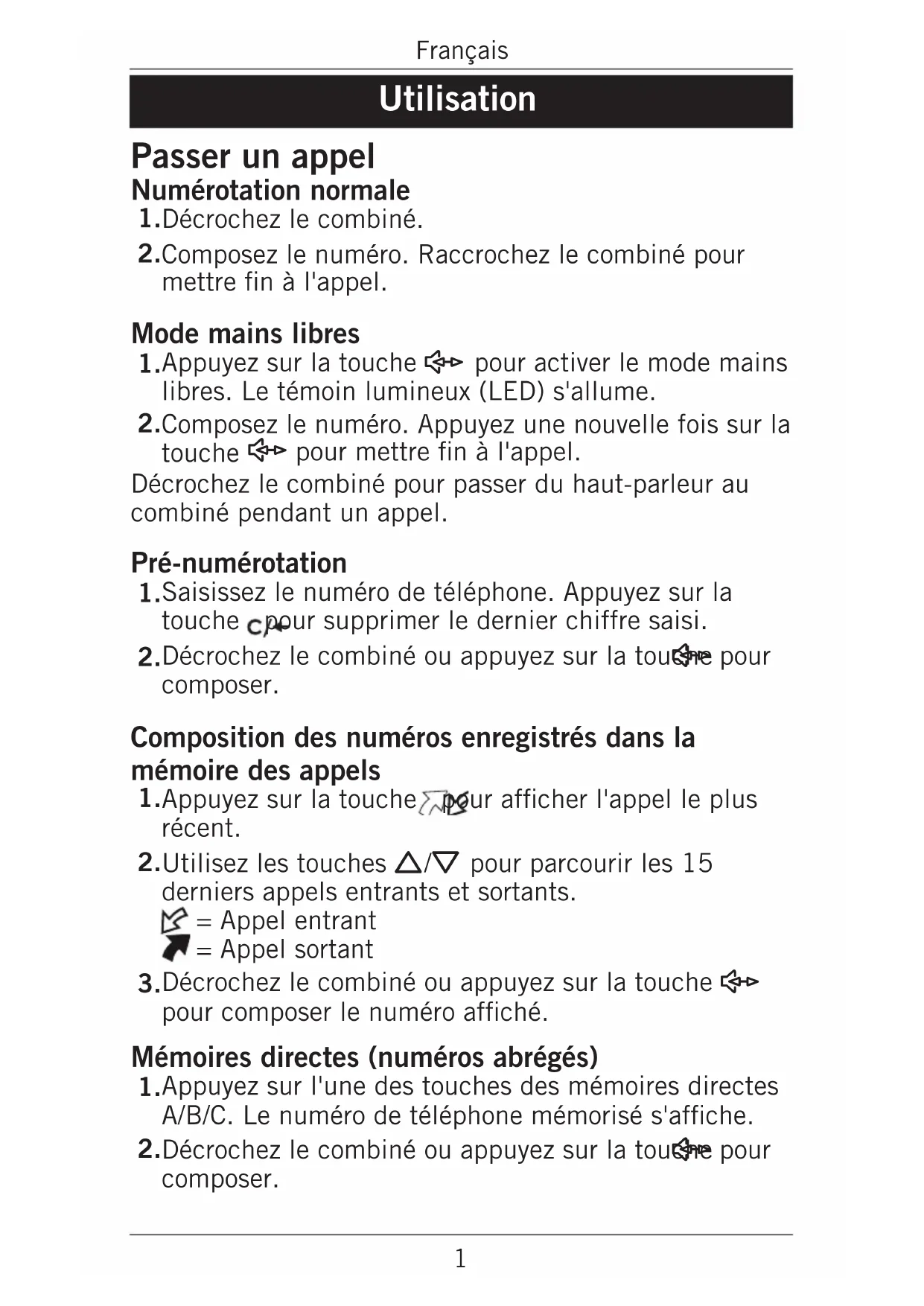 pour parcourir les 15 derniers appels entrants et sortants. = Appel entrant = Appel sortant Décrochez le combiné ou appuyez sur la touche