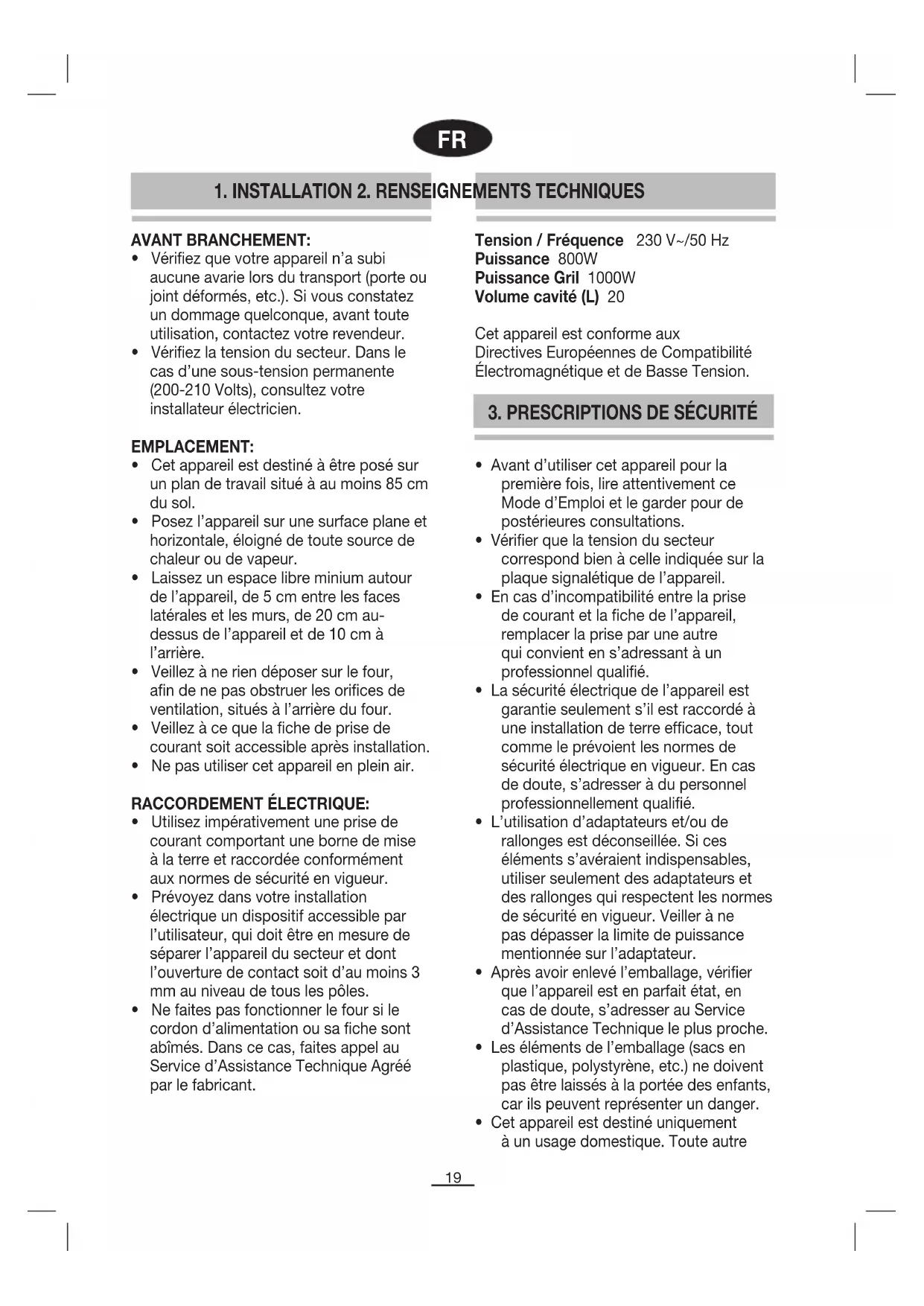 1. INSTALLATION 2. RENSEIGNEMENTS TECHNIQUES Tension / Fréquence 230 V~/50 Hz