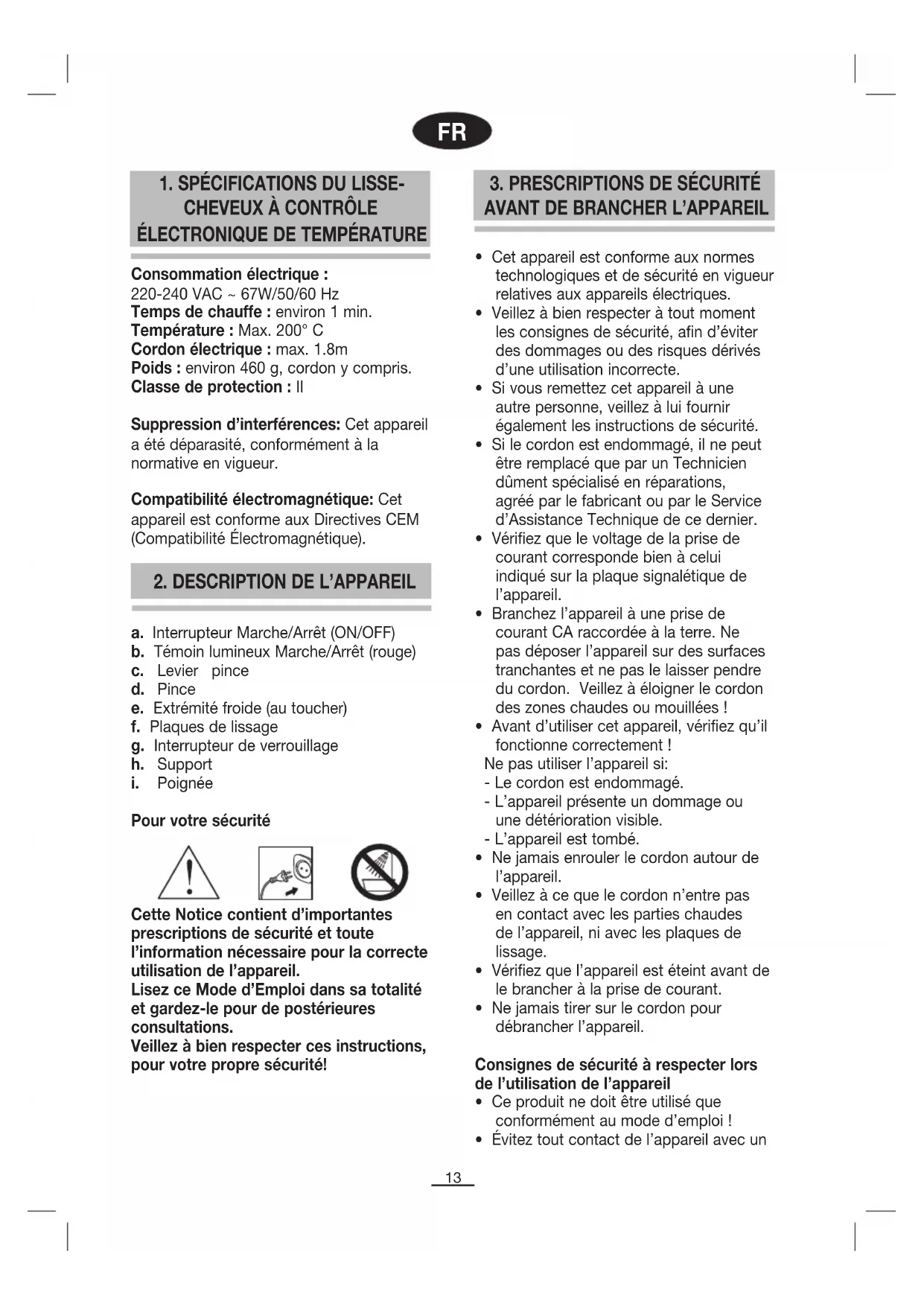 Température : Max. 200° C Cordon électrique : max. 1.8m