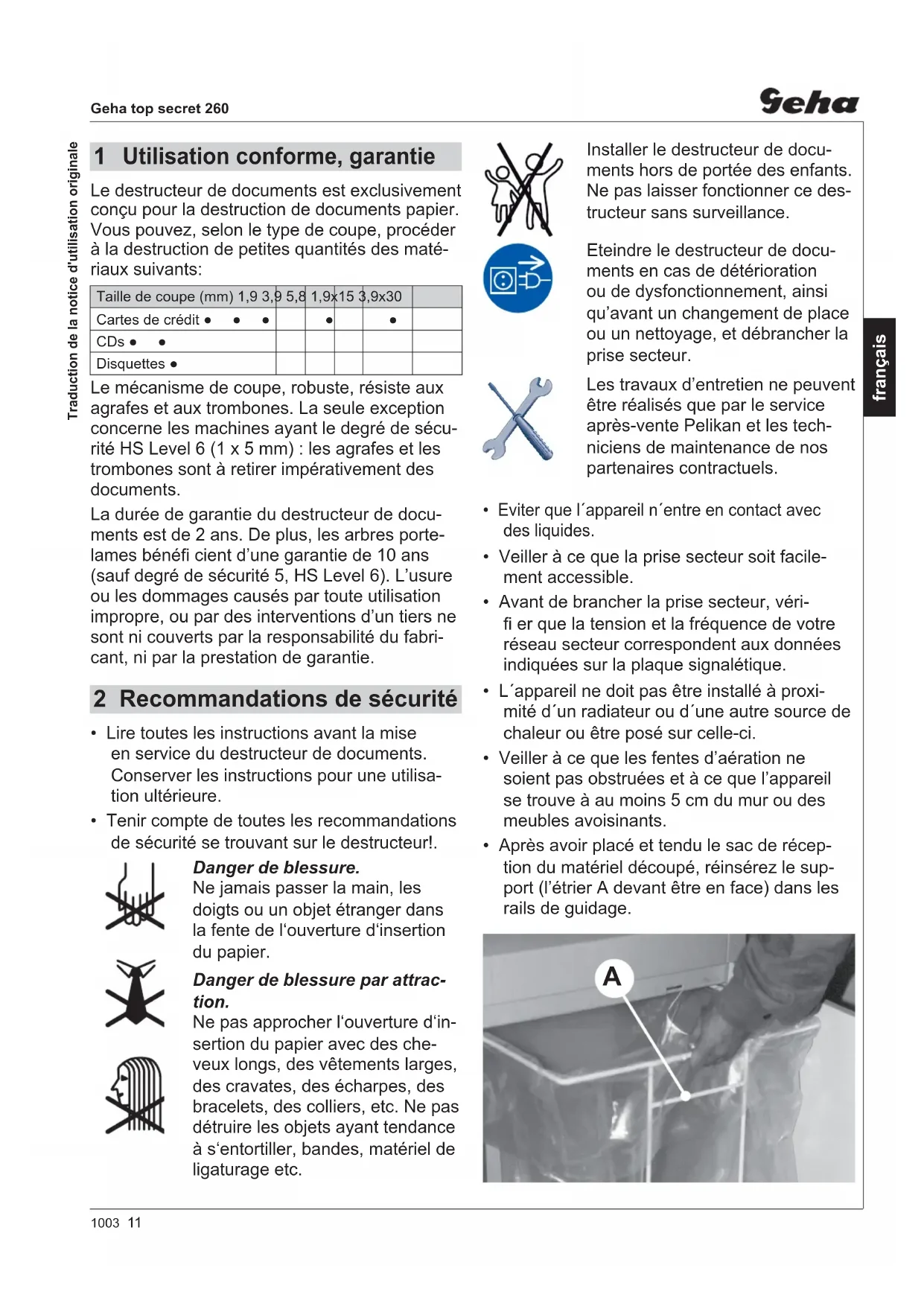 - EN 60950-1:20061003 11 Geha top secret 260 français Le destructeur de documents est exclusivement conçu pour la destruction de documents papier. Vous pouvez, selon le type de coupe, procéder à la destruction de petites quantités des maté- riaux suivants: Taille de coupe (mm) 1,9 3,9 5,8 1,9x15 3,9x30 Cartes de crédit ●●● ● ● CDs ●● Disquettes ● Le mécanisme de coupe, robuste, résiste aux agrafes et aux trombones. La seule exception concerne les machines ayant le degré de sécu- rité HS Level 6 (1 x 5 mm) : les agrafes et les trombones sont à retirer impérativement des documents. La durée de garantie du destructeur de docu- ments est de 2 ans. De plus, les arbres porte- lames bénéfi cient d’une garantie de 10 ans (sauf degré de sécurité 5, HS Level 6). L’usure ou les dommages causés par toute utilisation impropre, ou par des interventions d’un tiers ne sont ni couverts par la responsabilité du fabri- cant, ni par la prestation de garantie. Installer le destructeur de docu- ments hors de portée des enfants. Ne pas laisser fonctionner ce des- tructeur sans surveillance. Eteindre le destructeur de docu- ments en cas de détérioration ou de dysfonctionnement, ainsi qu’avant un changement de place ou un nettoyage, et débrancher la prise secteur. Les travaux d’entretien ne peuvent être réalisés que par le service après-vente Pelikan et les tech- niciens de maintenance de nos partenaires contractuels.