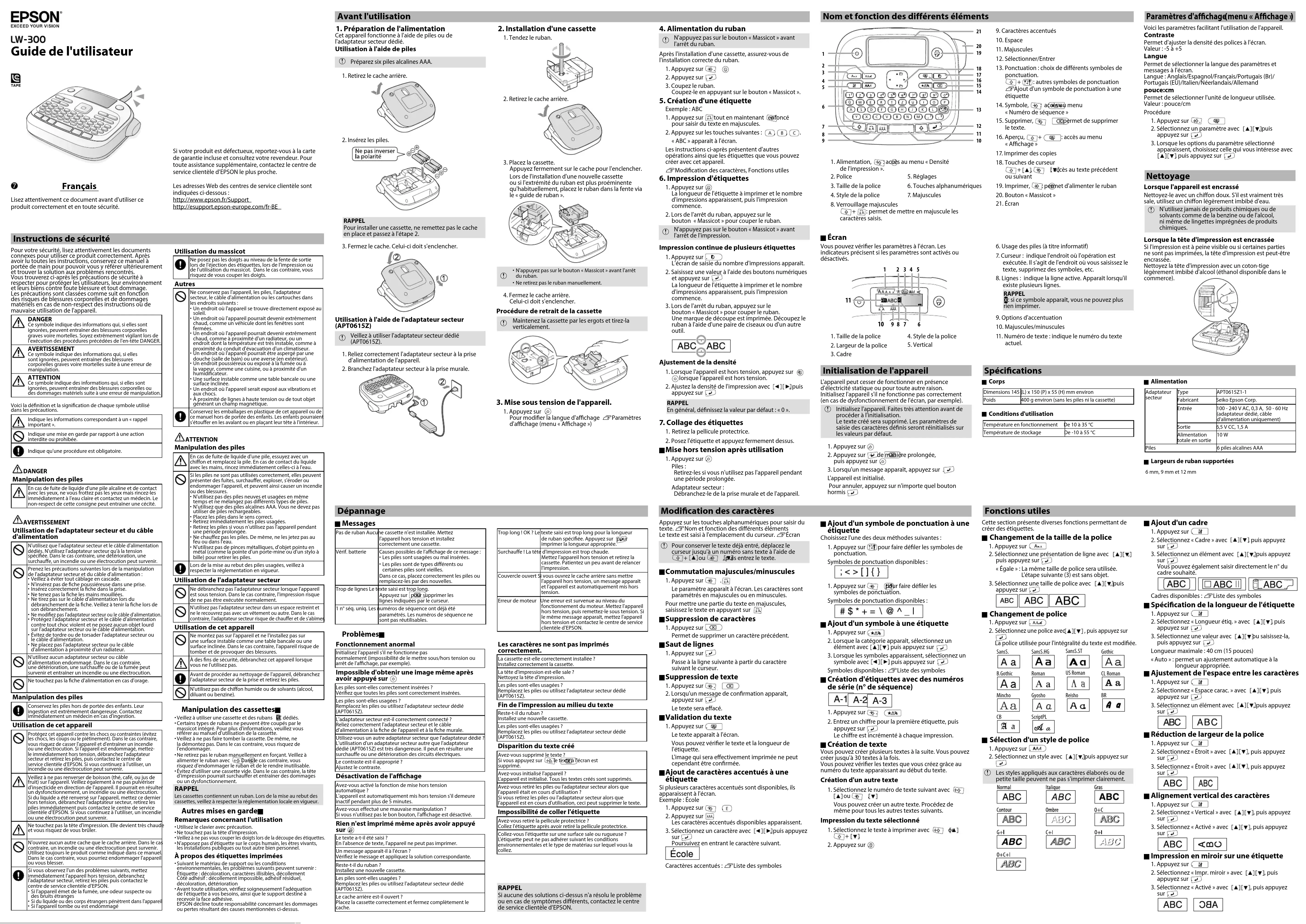 Lisez attentivement ce document avant d'utiliser ce produit correctement et en toute sécurité. Instructions de sécurité Pour votre sécurité, lisez attentivement les documents connexes pour utiliser ce produit correctement. Après avoir lu toutes les instructions, conservez ce manuel à portée de main pour pouvoir vous y référer ultérieurement et trouver la solution aux problèmes rencontrés.Vous trouverez ci-après les précautions de sécurité à respecter pour protéger les utilisateurs, leur environnement et leurs biens contre toute blessure et tout dommage.Les précautions sont classées comme suit en fonction des risques de blessures corporelles et de dommages matériels en cas de non-respect des instructions ou de mauvaise utilisation de l'appareil.DANGERCe symbole indique des informations qui, si elles sont ignorées, peuvent entraîner des blessures corporelles graves voire mortelles. Soyez extrêmement vigilant lors de l'exécution des procédures précédées de l'en-tête DANGER.AVERTISSEMENTCe symbole indique des informations qui, si elles sont ignorées, peuvent entraîner des blessures corporelles graves voire mortelles suite à une erreur de manipulation.ATTENTIONCe symbole indique des informations qui, si elles sont ignorées, peuvent entraîner des blessures corporelles ou des dommages matériels suite à une erreur de manipulation. Voici la définition et la signification de chaque symbole utilisé dans les précautions.Indique les informations correspondant à un « rappel important ».Indique une mise en garde par rapport à une action interdite ou prohibée.Indique qu'une procédure est obligatoire. DANGER Manipulation des piles En cas de fuite de liquide d'une pile alcaline et de contact avec les yeux, ne vous frottez pas les yeux mais rincez-les immédiatement à l'eau claire et contactez un médecin. Le non-respect de cette consigne peut entraîner une cécité. Guide de l'utilisateur Français Utilisation du massicot Ne posez pas les doigts au niveau de la fente de sortie lors de l'éjection des étiquettes, lors de l'impression ou de l'utilisation du massicot. Dans le cas contraire, vous risquez de vous couper les doigts. Autres Ne conservez pas l'appareil, les piles, l'adaptateur secteur, le câble d'alimentation ou les cartouches dans les endroits suivants :Un endroit où l'appareil se trouve directement exposé au soleil.Un endroit où l'appareil pourrait devenir extrêmement chaud, comme un véhicule dont les fenêtres sont fermées.Un endroit où l'appareil pourrait devenir extrêmement chaud, comme à proximité d'un radiateur, ou un endroit dont la température est très instable, comme à proximité du conduit d'évacuation d'un climatiseur.Un endroit où l'appareil pourrait être aspergé par une douche (salle de bain) ou une averse (en extérieur).Un endroit poussiéreux ou exposé à la fumée ou à la vapeur, comme une cuisine, ou à proximité d'un humidificateur.Une surface instable comme une table bancale ou une surface inclinée.Un endroit où l'appareil serait exposé aux vibrations et aux chocs.À proximité de lignes à haute tension ou de tout objet générant un champ magnétique.