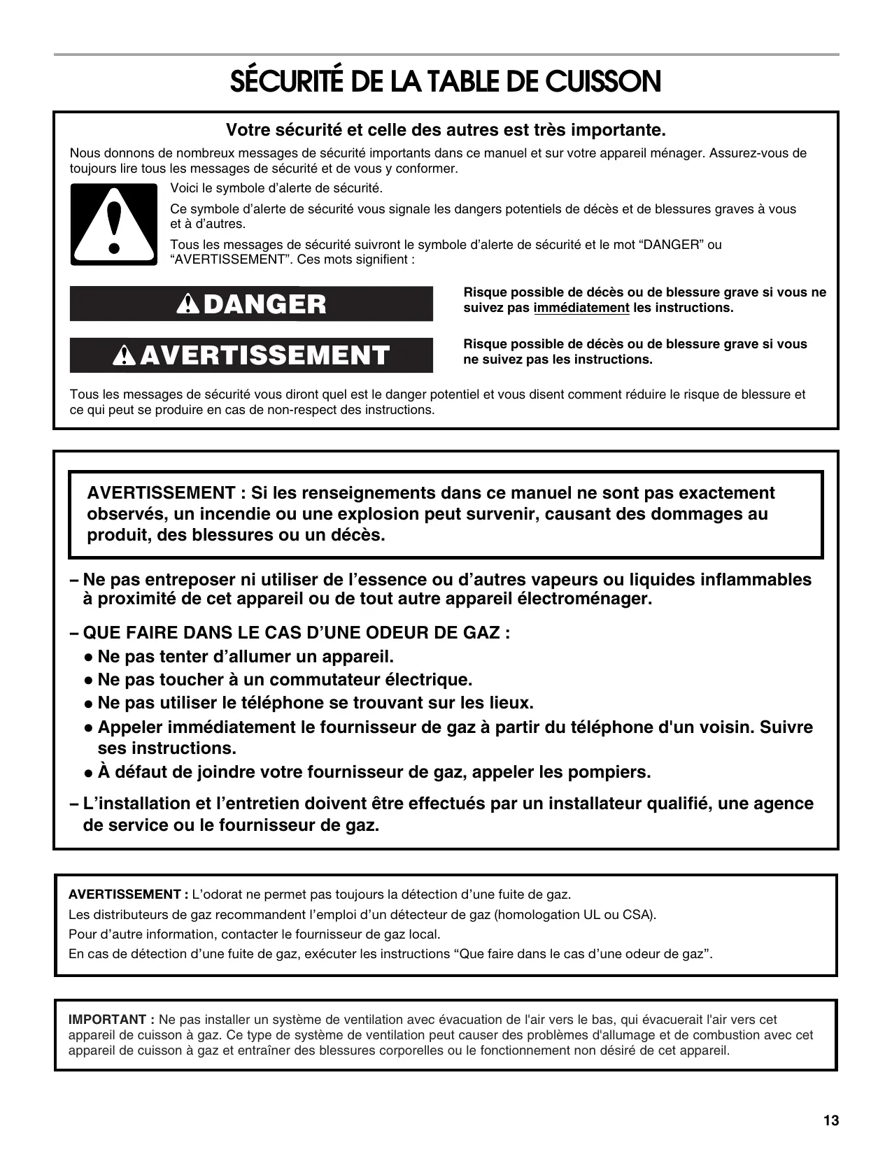 Les distributeurs de gaz recommandent l’emploi d’un détecteur de gaz (homologation UL ou CSA). Pour d’autre information, contacter le fournisseur de gaz local. En cas de détection d’une fuite de gaz, exécuter les instructions “Que faire dans le cas d’une odeur de gaz”. IMPORTANT : Ne pas installer un système de ventilation avec évacuation de l'air vers le bas, qui évacuerait l'air vers cet appareil de cuisson à gaz. Ce type de système de ventilation peut causer des problèmes d'allumage et de combustion avec cet appareil de cuisson à gaz et entraîner des blessures corporelles ou le fonctionnement non désiré de cet appareil.