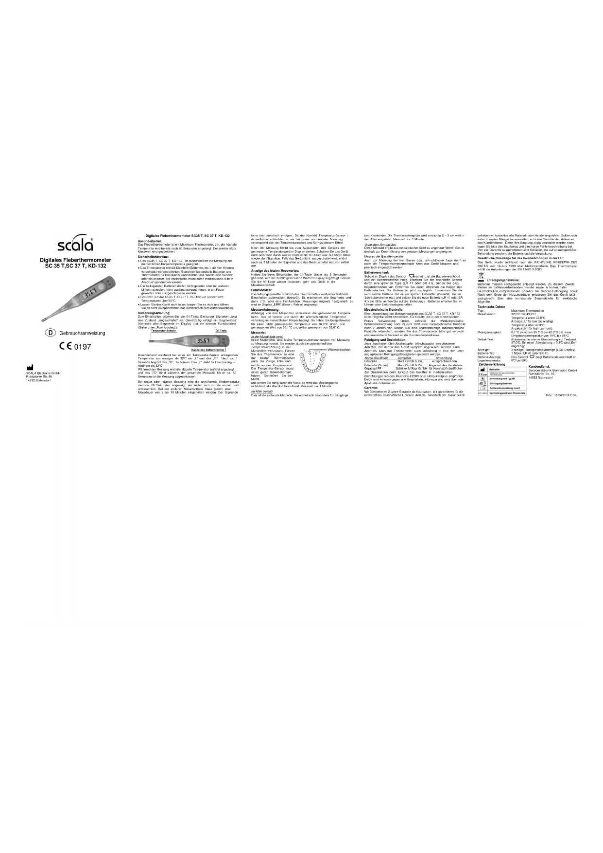Recommandations de mise anx déchets Les piles doivent être correctement déposés aux détritus. Dans le commerce spécialisé, de même qu’à des points de collectes communaux de déchets, des récipients de collecte pour la récupération des piles sont mis à disposition dans ce but. Après la fin de la durée d’emploi de l’appareil, veuillez jeter cellesi-ci de manière conforme aux points communaux de collectes pour les vieux appareils électriques. Caractéristiques techniques: Type: Thermomètre à mesure maximum Plage de mesure: 32,0°C à 43,9°C Température sous 32,0°C: Affichage « L » pour low ( trop bas) Température au dessus de 43,9°C: Affichage „H“ pour high (trop haut). Précision de température: 0,1°C entre 35,5°C jusqu’à 42,0°C en présence d’une température ambiante de 18°C à 28°C. Test automatique: Contrôle automatique interne, contrôle de la valeur de test de 37,0°C. En présence d’une variation > 0,1°C « Err » sera affiché. Affichage: Affichage à cristaux liquides à 3 caractères (écran LCD). Type de pile: 1 pile: LR 41 ou SR 41. Affichage de pile: Le symbole indique que la pile est épuisée. Température de conservation: 0°C à 50°C. Service client: Sensorelektronik Stahnsdorf GmbH Ruhlsdorfer Str. 95 14532 Stahnsdorf GermanyTermómetro clínico SC 35 T,SC 37 T, KD-132
