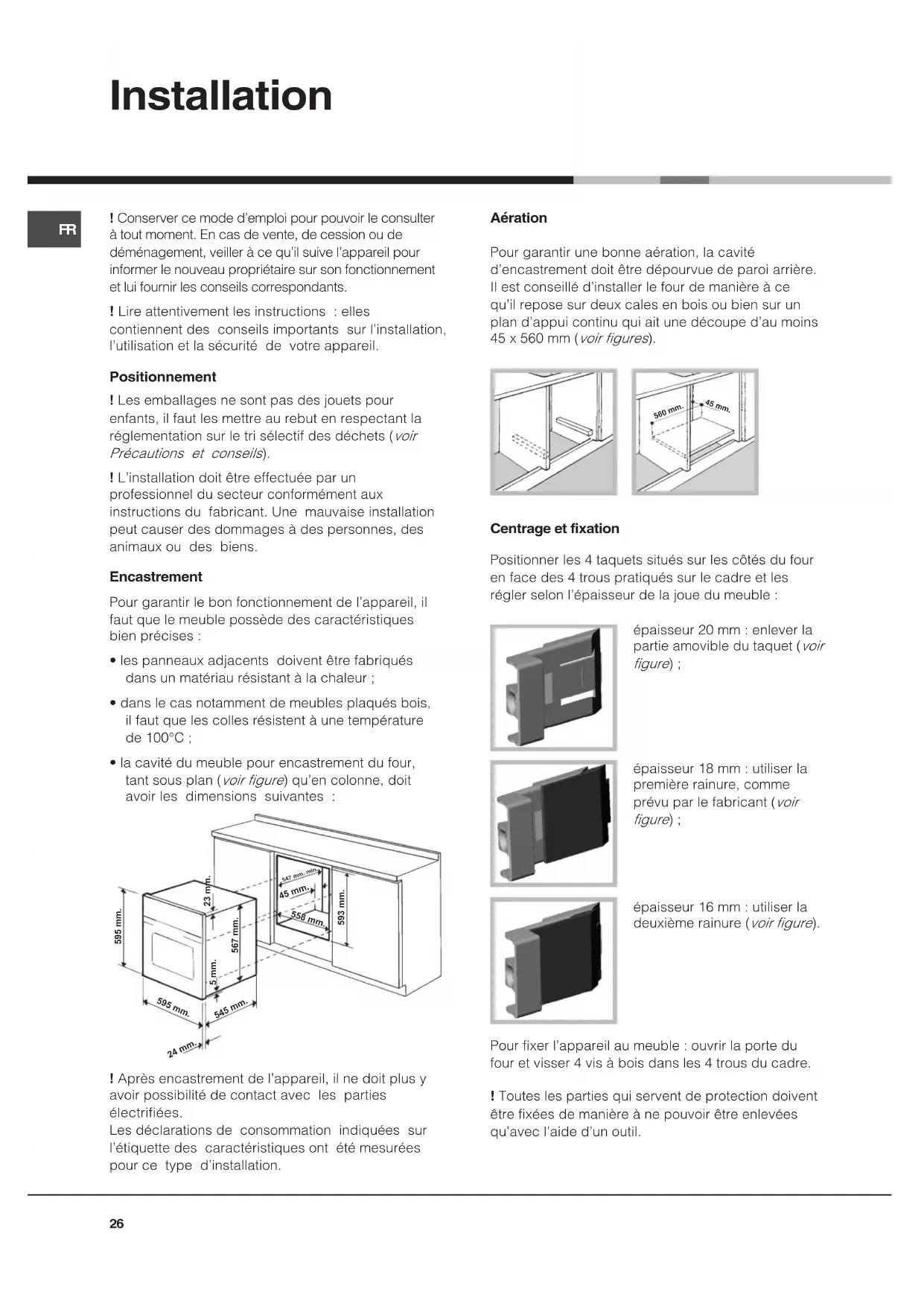 Aération Pour garantir une bonne aération, la cavité dencastrement doit être dépourvue de paroi arrière. Il est conseillé dinstaller le four de manière à ce quil repose sur deux cales en bois ou bien sur un plan dappui continu qui ait une découpe dau moins 45 x 560 mm (voir figures). Centrage et fixation Positionner les 4 taquets situés sur les côtés du four en face des 4 trous pratiqués sur le cadre et les régler selon lépaisseur de la joue du meuble : épaisseur 20 mm : enlever la partie amovible du taquet (voir figure) ; épaisseur 18 mm : utiliser la première rainure, comme prévu par le fabricant (voir figure) ; épaisseur 16 mm : utiliser la deuxième rainure (voir figure). Pour fixer lappareil au meuble : ouvrir la porte du four et visser 4 vis à bois dans les 4 trous du cadre. ! Toutes les parties qui servent de protection doivent être fixées de manière à ne pouvoir être enlevées quavec laide dun outil. ! Conserver ce mode demploi pour pouvoir le consulter à tout moment. En cas de vente, de cession ou de déménagement, veiller à ce quil suive lappareil pour informer le nouveau propriétaire sur son fonctionnement et lui fournir les conseils correspondants. ! Lire attentivement les instructions : elles contiennent des conseils importants sur linstallation, lutilisation et la sécurité de votre appareil. Positionnement ! Les emballages ne sont pas des jouets pour enfants, il faut les mettre au rebut en respectant la réglementation sur le tri sélectif des déchets (voir Précautions et conseils). ! Linstallation doit être effectuée par un professionnel du secteur conformément aux instructions du fabricant. Une mauvaise installation peut causer des dommages à des personnes, des animaux ou des biens. Encastrement Pour garantir le bon fonctionnement de lappareil, il faut que le meuble possède des caractéristiques bien précises : les panneaux adjacents doivent être fabriqués dans un matériau résistant à la chaleur ; dans le cas notamment de meubles plaqués bois, il faut que les colles résistent à une température de 100°C ; la cavité du meuble pour encastrement du four, tant sous plan (voir figure) quen colonne, doit avoir les dimensions suivantes : ! Après encastrement de lappareil, il ne doit plus y avoir possibilité de contact avec les parties électrifiées. Les déclarations de consommation indiquées sur létiquette des caractéristiques ont été mesurées pour ce type dinstallation. 595 mm. 595 mm.24 mm.545 mm. 5 mm. 567 mm. 23 mm. 593 mm. 45 mm.558 mm.547 mm. min. Installation 560 mm. 45 mm.FR