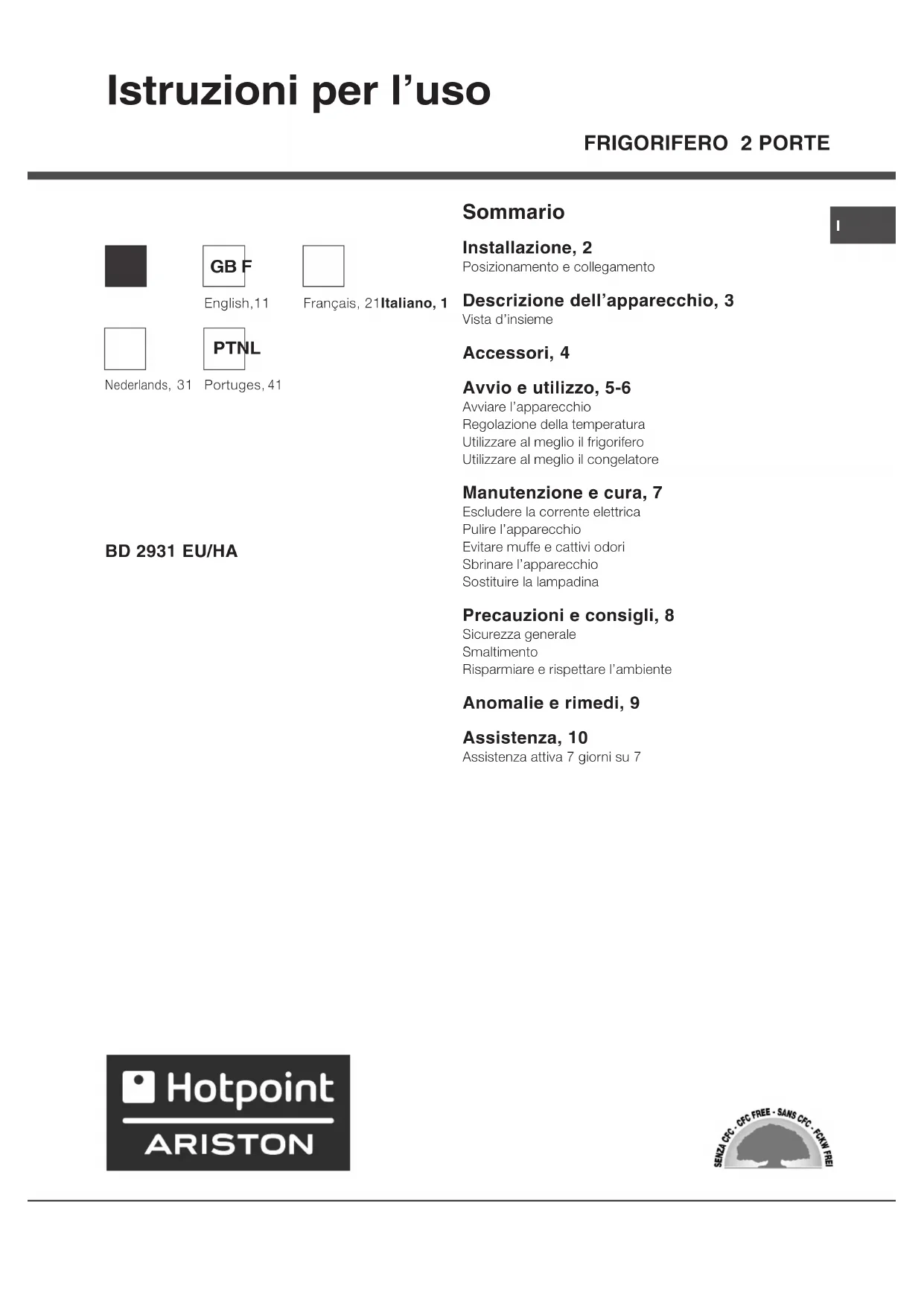 BD 2931 EUHA - Réfrigérateur HOTPOINT - Notice d'utilisation et mode d'emploi gratuit