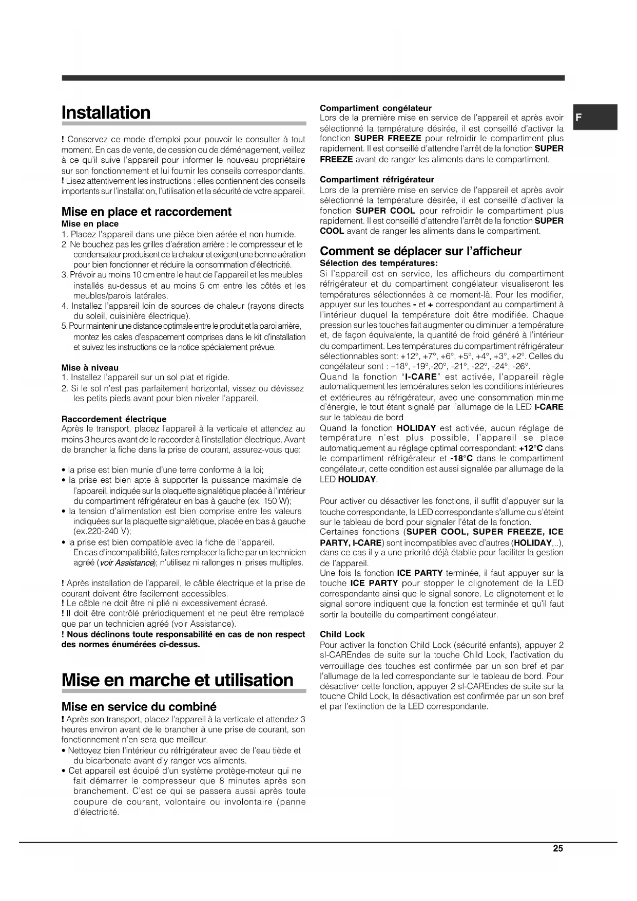 Mise en service du combiné ! Après son transport, placez l’appareil à la verticale et attendez 3heures environ avant de le brancher à une prise de courant, sonfonctionnement n’en sera que meilleur.• Nettoyez bien l’intérieur du réfrigérateur avec de l’eau tiède etdu bicarbonate avant d’y ranger vos aliments.• Cet appareil est équipé d’un système protège-moteur qui nefait démarrer le compresseur que 8 minutes après sonbranchement. C’est ce qui se passera aussi après toutecoupure de courant, volontaire ou involontaire (panned’électricité.Compartiment congélateurLors de la première mise en service de l’appareil et après avoirsélectionné la température désirée, il est conseillé d’activer la fonction SUPER FREEZE pour refroidir le compartiment plus rapidement. Il est conseillé d’attendre l’arrêt de la fonction SUPERFREEZE avant de ranger les aliments dans le compartiment.Compartiment réfrigérateurLors de la première mise en service de l’appareil et après avoirsélectionné la température désirée, il est conseillé d’activer la fonction SUPER COOL pour refroidir le compartiment plus rapidement. Il est conseillé d’attendre l’arrêt de la fonction SUPERCOOL avant de ranger les aliments dans le compartiment. Comment se déplacer sur l’afficheur Sélection des températures:Si l’appareil est en service, les afficheurs du compartimentréfrigérateur et du compartiment congélateur visualiseront lestempératures sélectionnées à ce moment-là. Pour les modifier, appuyer sur les touches - et + correspondant au compartiment à l’intérieur duquel la température doit être modifiée. Chaquepression sur les touches fait augmenter ou diminuer la températureet, de façon équivalente, la quantité de froid généré à l’intérieurdu compartiment. Les températures du compartiment réfrigérateursélectionnables sont: +12°, +7°, +6°, +5°, +4°, +3°, +2°. Celles ducongélateur sont : –18°, -19°,-20°, -21°, -22°, -24°, -26°. Quand la fonction “I-CARE” est activée, l’appareil règle automatiquement les températures selon les conditions intérieureset extérieures au réfrigérateur, avec une consommation minimed’énergie, le tout étant signalé par l’allumage de la LED I-CAREsur le tableau de bord Quand la fonction HOLIDAY est activée, aucun réglage de température n’est plus possible, l’appareil se place automatiquement au réglage optimal correspondant: +12°C dans