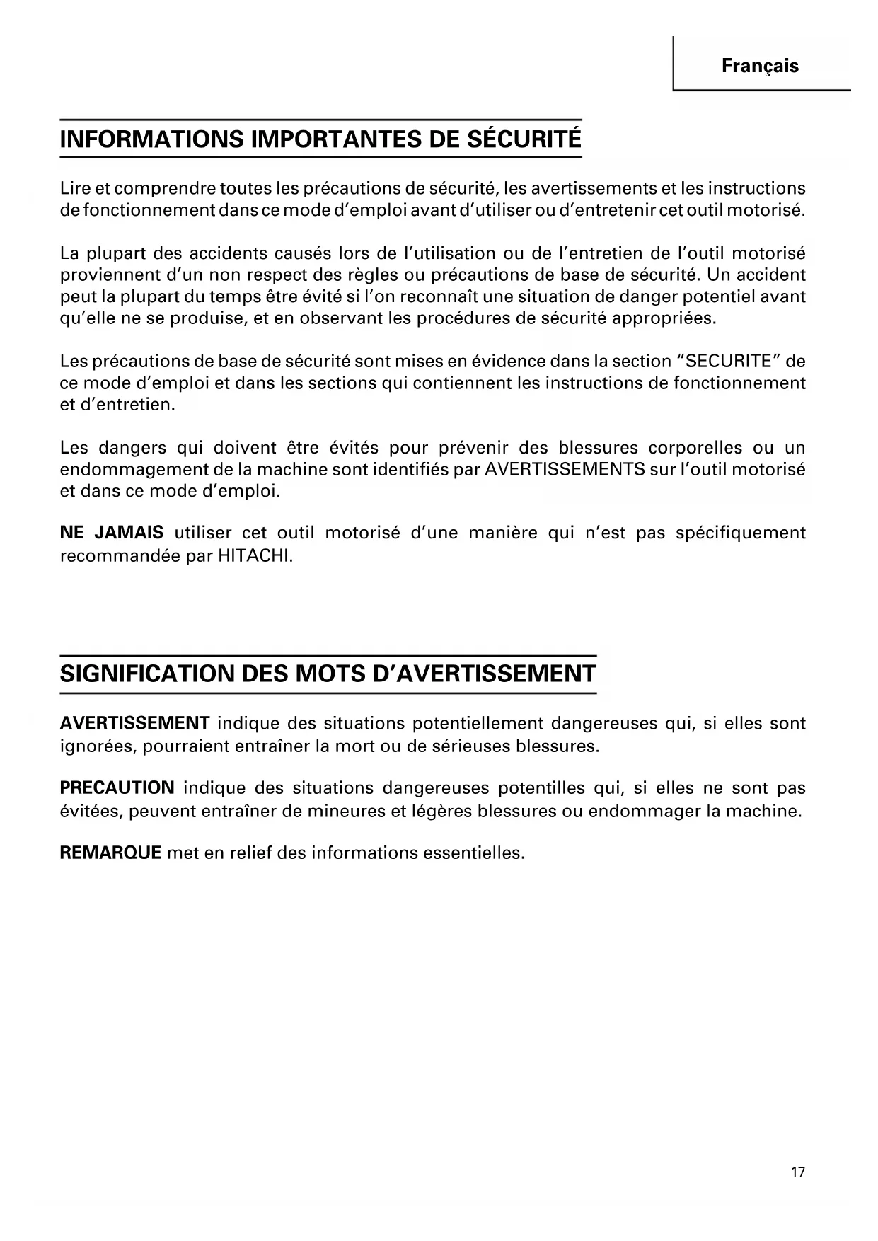 Les dangers qui doivent être évités pour prévenir des blessures corporelles ou un endommagement de la machine sont identifiés par AVERTISSEMENTS sur l'outil motorisé et dans ce mode d'emploi.