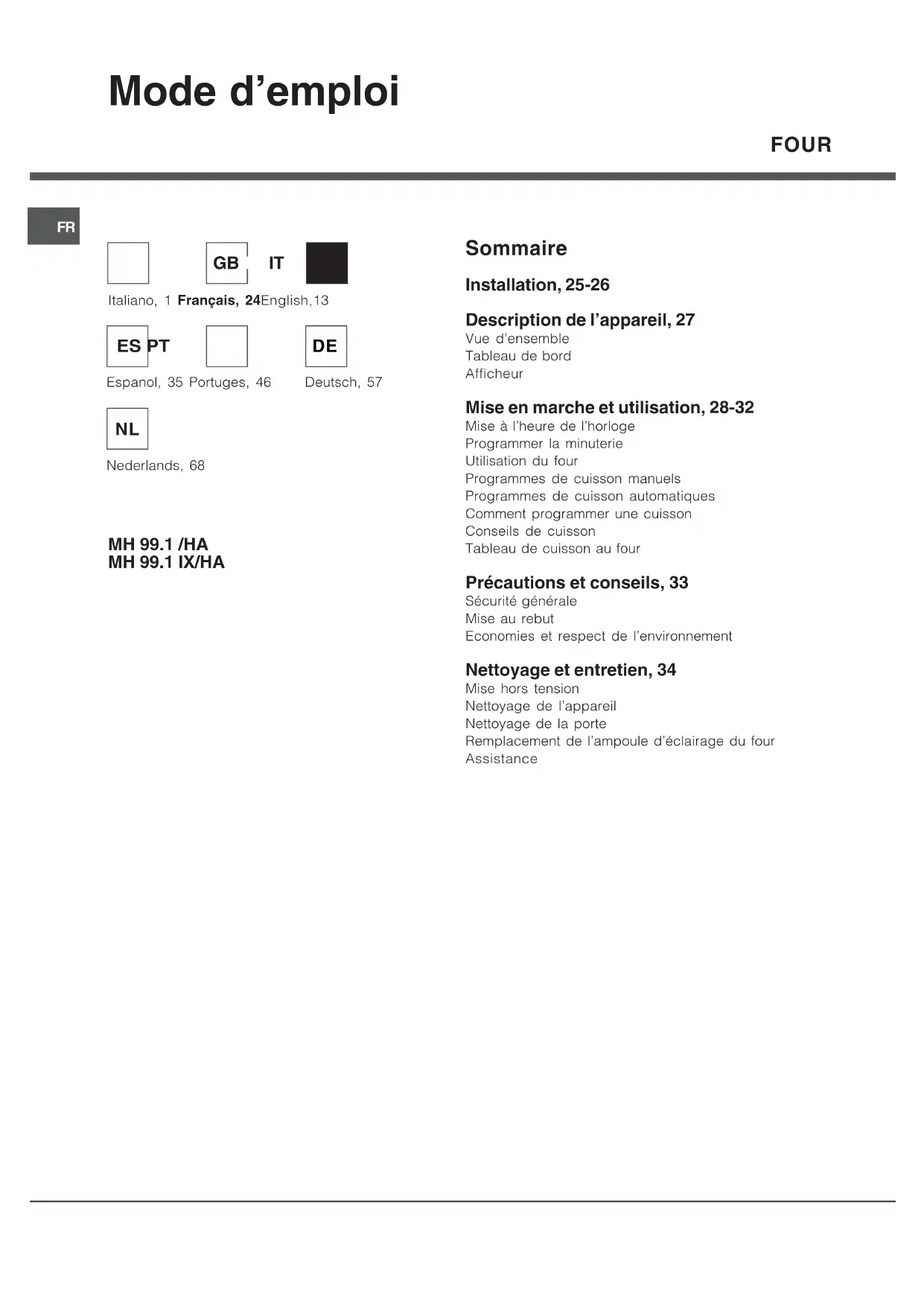 - The serial number (S/N). The latter two pieces of information can be found on the data plate located on the appliance.FR FOUR MH 99.1 /HA MH 99.1 IX/HA Sommaire Installation, 25-26 Description de l’appareil, 27 Vue d’ensemble Tableau de bord Afficheur Mise en marche et utilisation, 28-32 Mise à l’heure de l’horloge Programmer la minuterie Utilisation du four Programmes de cuisson manuels Programmes de cuisson automatiques Comment programmer une cuisson Conseils de cuisson Tableau de cuisson au four Précautions et conseils, 33 Sécurité générale Mise au rebut Economies et respect de l’environnement Nettoyage et entretien, 34 Mise hors tension Nettoyage de l’appareil Nettoyage de la porte Remplacement de l’ampoule d’éclairage du four Assistance Mode d’emploi Italiano, 1 Français, 24English,13 GB FRIT Espanol, 35 Portuges, 46 ES PT Nederlands, 68