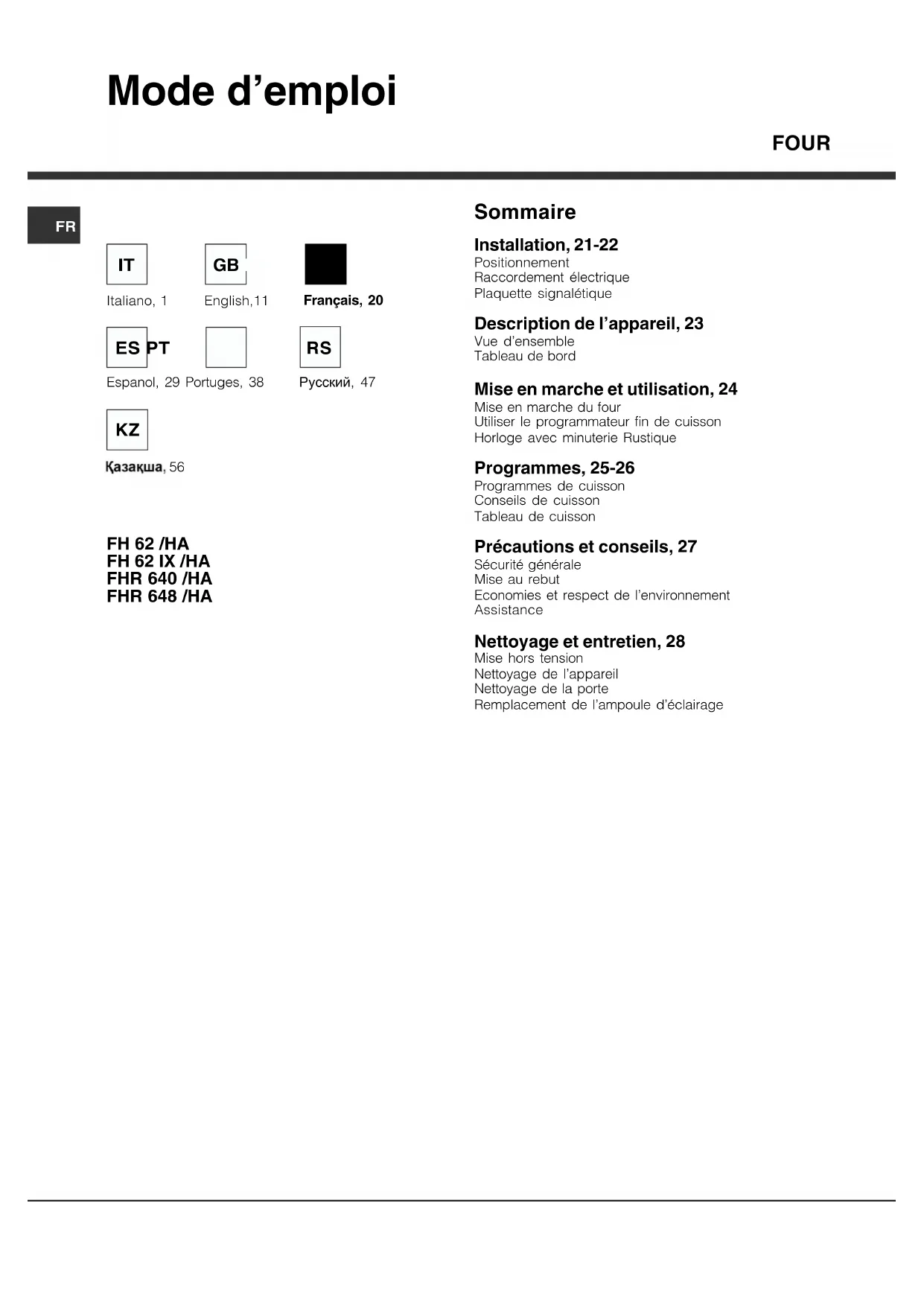 FH 62 (WH)HA - Four HOTPOINT-ARISTON - Notice d'utilisation et mode d'emploi gratuit