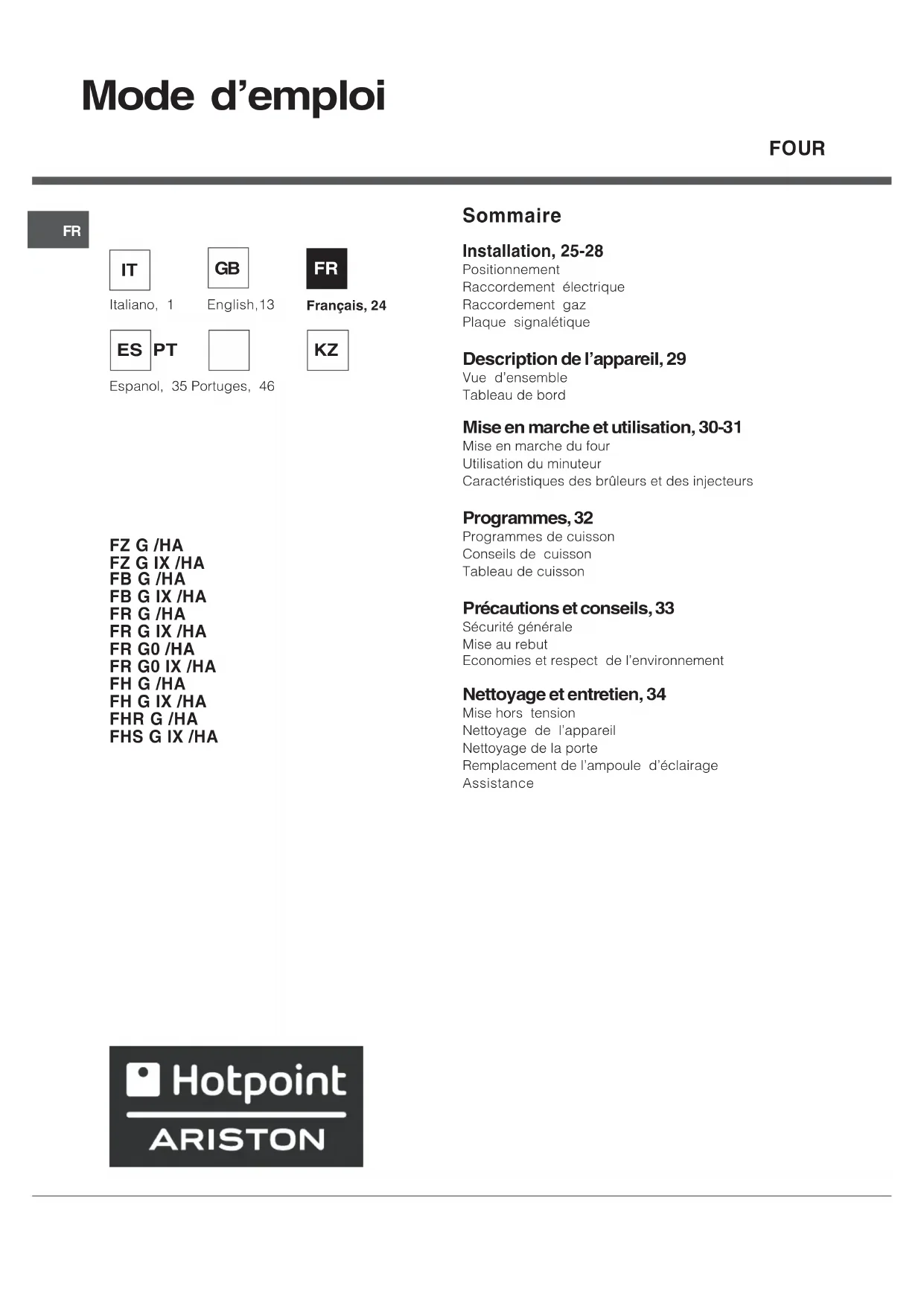 FHR G (AN)HA - Four HOTPOINT-ARISTON - Notice d'utilisation et mode d'emploi gratuit