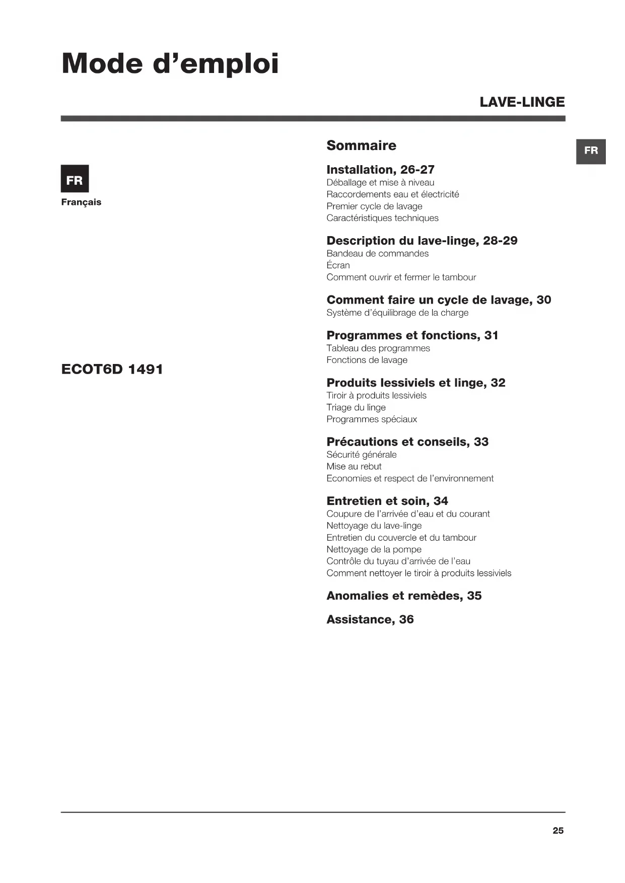 Français Sommaire Installation, 26-27 Déballage et mise à niveau Raccordements eau et électricité Premier cycle de lavage Caractéristiques techniques Description du lave-linge, 28-29 Bandeau de commandes Écran Comment ouvrir et fermer le tambour Comment faire un cycle de lavage, 30 Système d’équilibrage de la charge Programmes et fonctions, 31 Tableau des programmes Fonctions de lavage Produits lessiviels et linge, 32 Tiroir à produits lessiviels Triage du linge Programmes spéciaux Précautions et conseils, 33 Sécurité générale Mise au rebut Economies et respect de l’environnement Entretien et soin, 34 Coupure de l’arrivée d’eau et du courant Nettoyage du lave-linge Entretien du couvercle et du tambour Nettoyage de la pompe Contrôle du tuyau d’arrivée de l’eau Comment nettoyer le tiroir à produits lessiviels Anomalies et remèdes, 35 Assistance, 36