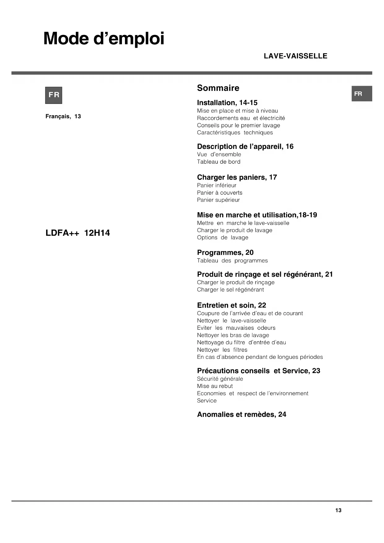 LDFA++ 12H14 X EU - Lave-vaisselle HOTPOINT ARISTON - Notice d'utilisation et mode d'emploi gratuit