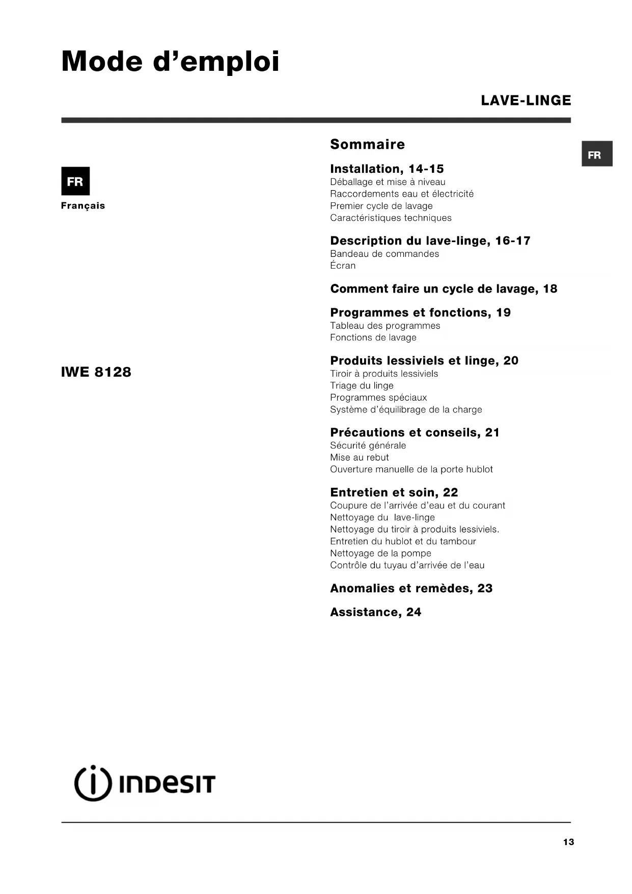 MODE D'EMPLOI Maxi IWE 8128 B (EU) INDESIT