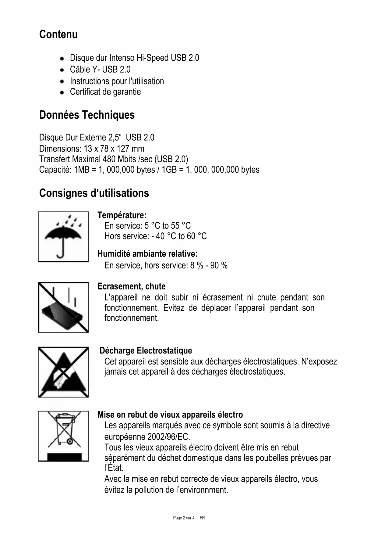 Les réclamations sous garantie ne sont pas prises en compte dans le cas de non respect du manuel d'utilisation d'intenso ainsi que dans le cas d'assemblage incorrect, d'utilisation ou de défaillances autres apparueils.