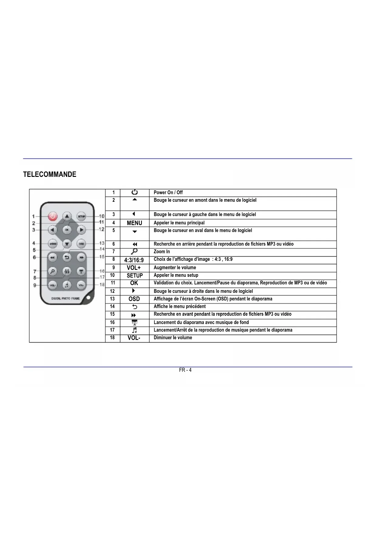 3. Appuyez sur la touche [] du CPN ou sur la touche OK de la télécommande afin de lancer le diaporama commençant avec la photo choisie. Remarque : Si vous avez lancé l’affichage d’une seule image à partir d’un dossier, prenez en considération que le diaporama ne peut qu’afficher continuellement les images de ce dossier.FR - 14 Changer le mode d’affichage Pendant l’affichage d’une image ou le diaporama, vous pouvez appuyer plusieurs fois sur la touche [4:3/16:9] de la télécommande afin de changer le mode d’affichage. 4:3: Quand vous choisissez ce mode, une image qui est mémorisée au format 16:9 sera tendue et affichée comme plein écran. 16:9: Quand vous choissisez ce mode, une image qui est mémorisée au format 16 :9 sera affichée au format original avec des bandes noires en haut et en bas de l’écran. Remarques : Une photo qui a été mémorisée au format 4:3 ne peut être affichée qu’au même format. Cette fonction ne sera pas active s’il s’agit de photos avec une résolution inférieure à 1024 X 768 pixels.FR - 15 Utilisation du menu OSD Vous pouvez utiliser le menu OSD pour effectuer les actions suivantes. 1. Appuyez sur la touche [OSD] de la télécommande ou sur la touche [M] du CPN en regardant une image ou un diaporama. Le menu OSD sera affiché sur l’écran et le diaporama sera stoppé.