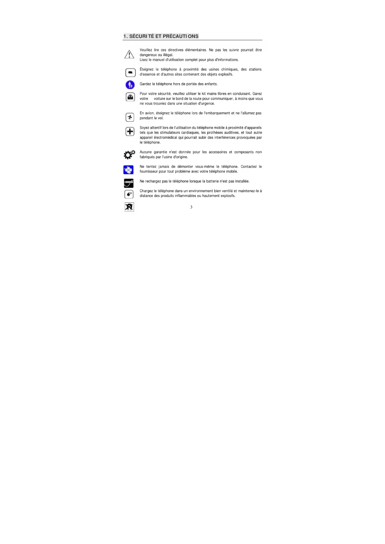Soyez attentif lors de l'utilisation du téléphone mobile à proximité d'appareils tels que les stimulateurs cardiaques, les prothèses auditives, et tout autre appareil électromédical qui pourrait subir des interférences provoquées par le téléphone.